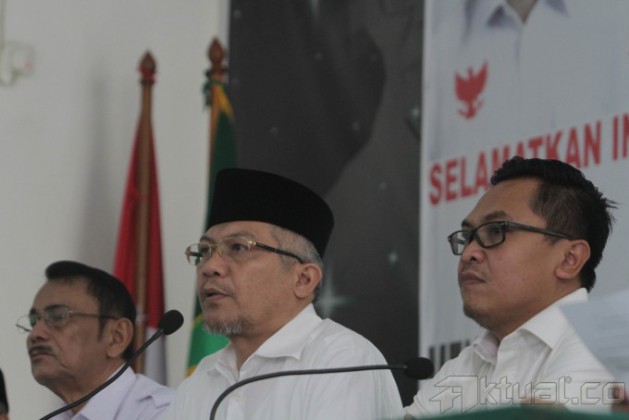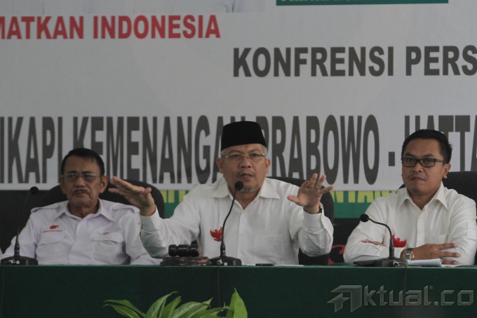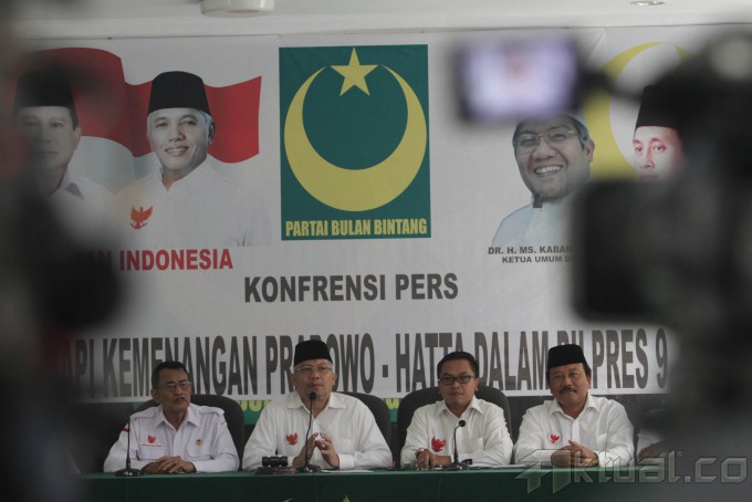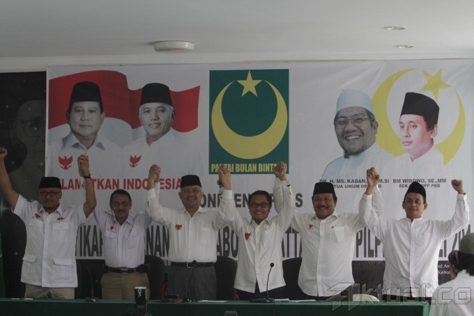Tim Kampanye Nasional Prabowo-Hatta Partai Bulan Bintang (PBB) Didik Haryanto, Tim Kampanye Nasional Prabowo-Hatta PBB Adityawarman, Anggota Dewan Penasehat Tim Kampanye Nasional Prabowo-Hatta yang juga Ketua Umum DPP PBB MS Kaban, Tim Kampanye Nasional Prabowo-Hatta PBB Sukmo Harsono, Ketua Tim Kampanye Nasional Prabowo-Hatta PBB Dwiyanto Ananias dan Tim Kampanye Nasional Prabowo-Hatta PBB yang juga Sekjen DPP PBB BM Wibowo mengangkat tangan bersama usai memberikan keterangan pers, di Kantor DPP PBB, Jakarta, Jum’at (11/7/2014). Menanggapi perbedaan hasil sementara hitung cepat dari sejumlah lembaga survei terkait pemenang pada Pemilu Presiden 9 Juli 2014 lalu, mereka menghimbau agar semua pihak menahan diri dan tidak terprovokasi oleh pihak-pihak yang dapat mengambil keuntungan, mereka juga berjanji akan mengawal proses penghitungan suara ini dari TPS hingga pengumuman yang dikeluarkan Komisi Pemilihan Umum (KPU) serta akan menghormati hasilnya sesuai yang diamanatkan Capres Prabowo Subianto. Aktual/Tino Oktaviano