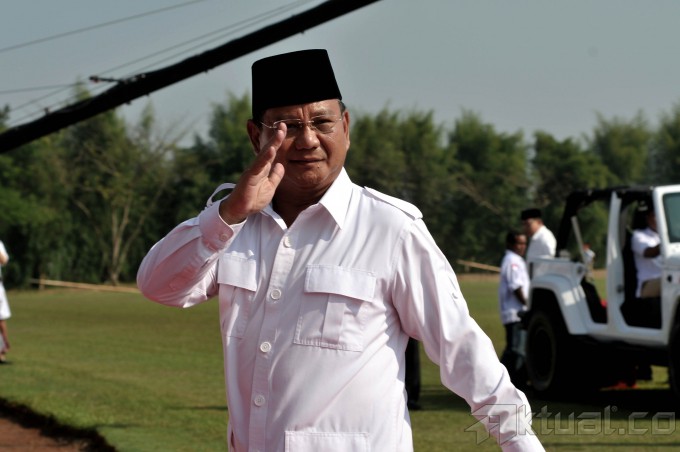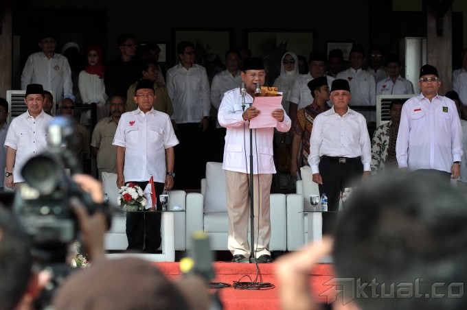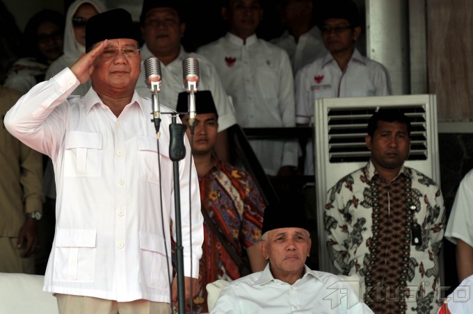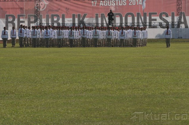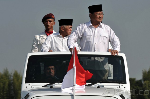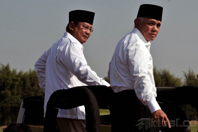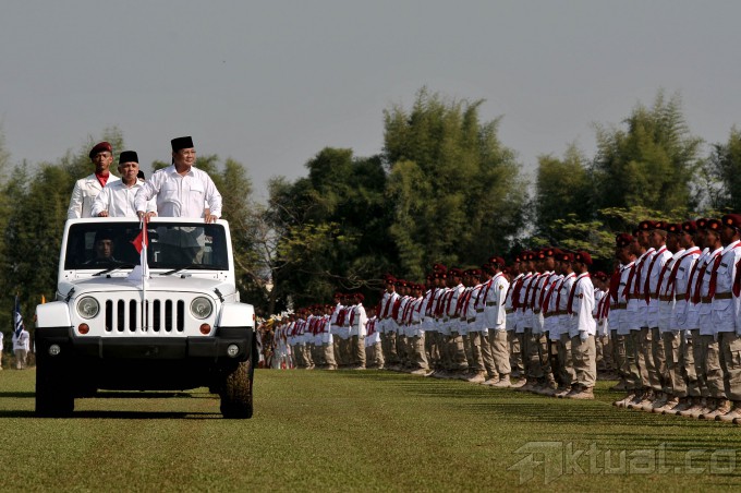 Capres Prabowo Subianto (kanan) didampingi Cawapres Hatta Rajasa (kiri) dan Ketua Umum Golkar Aburizal Bakrie (tengah) memeriksa pasukan saat upacara peringatan HUT ke-69 Kemerdekaan RI di Lapangan Nusantara Polo Club, Cibinong, Jabar, Minggu (17/8/2014). Upacara tersebut juga dihadiri sejumlah tokoh nasional dan perwakilan parpol koalisi meraah putih. Aktual/str