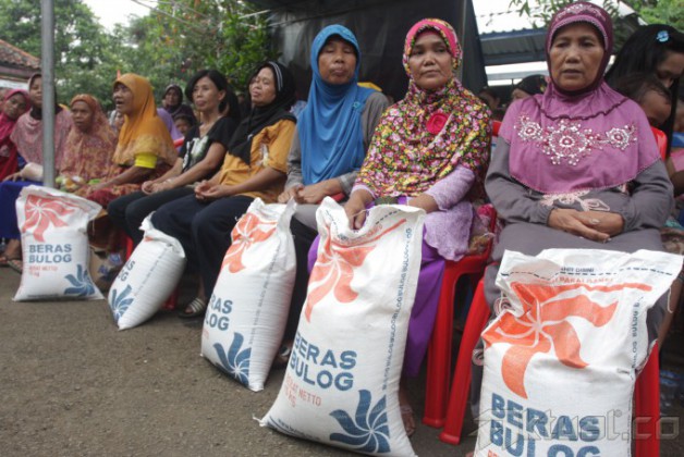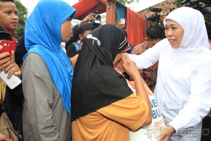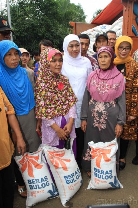 Menteri Sosial Khofifah Indar Parawansa saat menghadiri penyaluran beras bagi warga miskin (raskin) di Kelurahan Ciketing Udik, Kota Bekasi, Jumat (27/2/2015). Khofifah menegaskan saat ini pemerintah memiliki stok beras 1,4 juta ton dan cukup hingga Mei 2015. Sebanyak delapan ton beras untuk 550 rumah tangga sasaran disalurkan di lokasi tersebut. AKTUAL/JUNAIDI MAHBUB