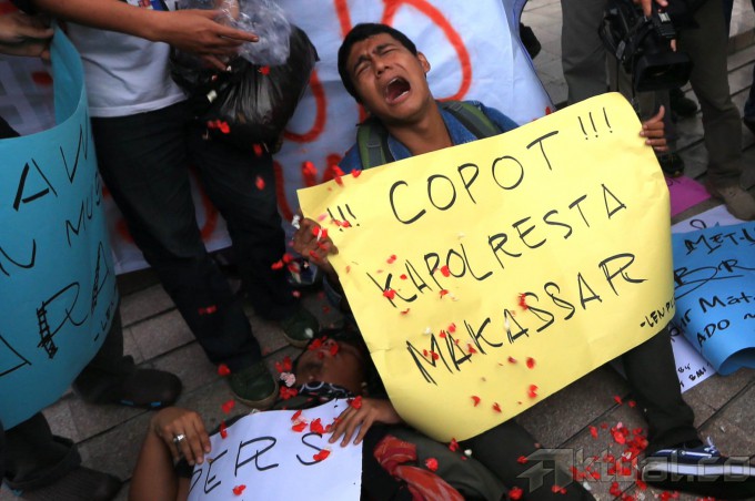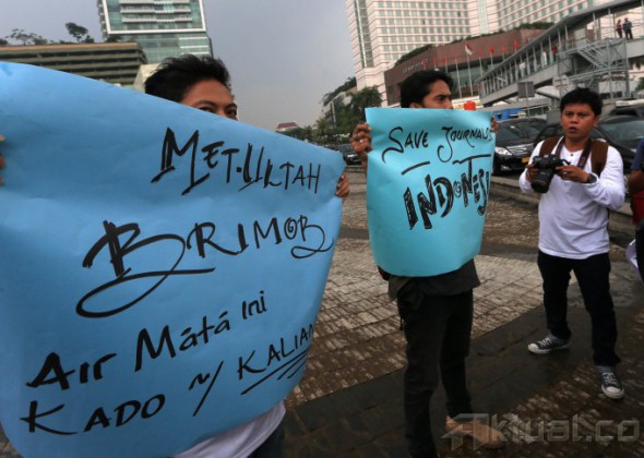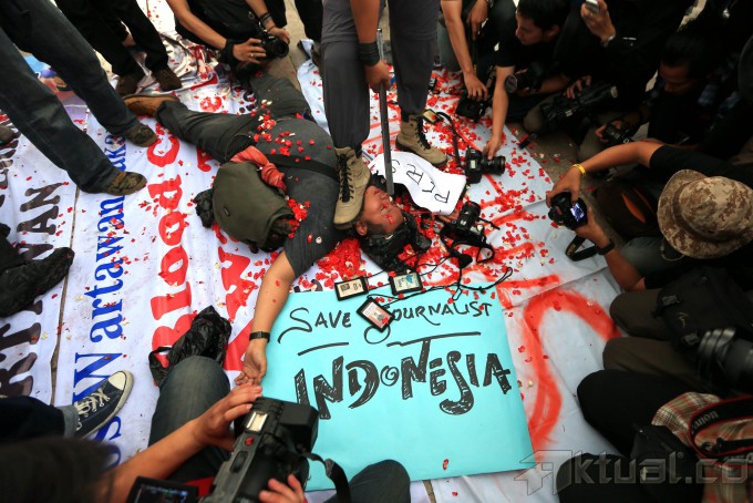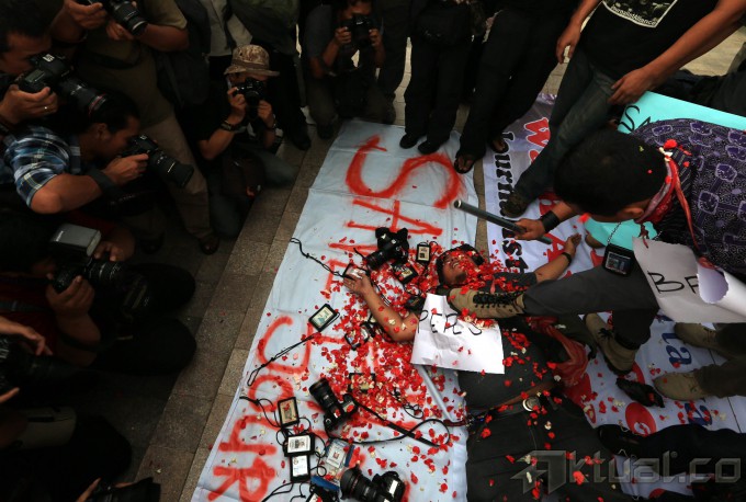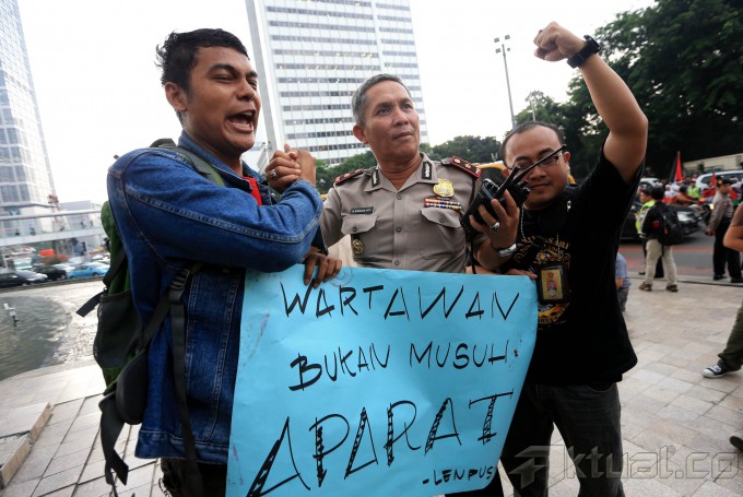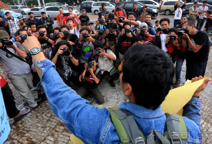 Puluhan wartawan dan pewarta foto menggelar aksi di Bundaran HI, Jakarta, Jumat (14/11/2014). Aksi tersebut menyikapi kekerasan terhadap wartawan saat peliputan unjuk rasa penolakan kenaikan Bahan Bakar Minyak (BBM), di Makassar, Sulawesi Sulatan, Kamis (13/11). AKTUAL/TINO OKTAVIANO
