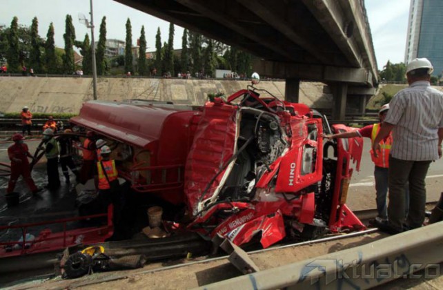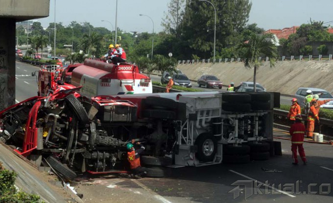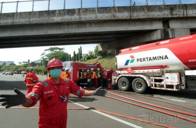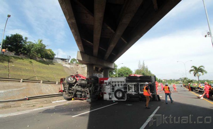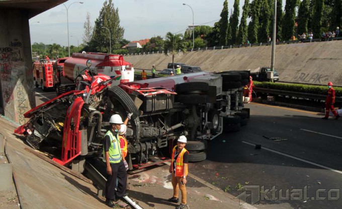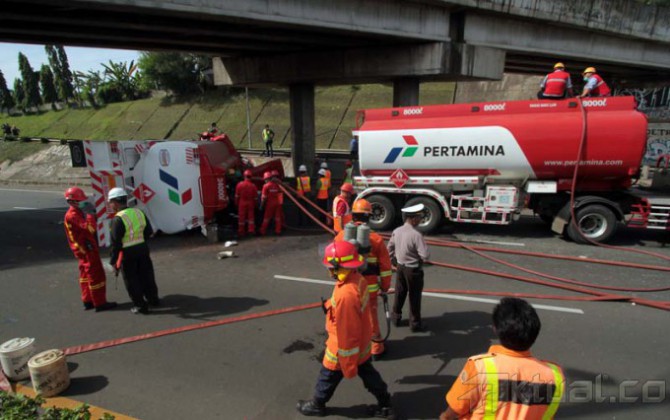 Petugas mengevakuasi truk tangki Bahan Bakar Minyak (BBM) yang terguling di lajur1 dan 2 KM 19+800 Tol JORR Pondok Pinang arah Bintaro, Jakarta (29/12/2013). Truk Tangki bernopol B 9363 SEH yang bermuatan premium 24 kiloliter tersebut terguling diakibatkan supir mengantuk. Aktual/Tino Oktaviano