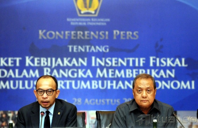 Menteri Keuangan M. Chatib Basri (kiri) bersama Menteri Perindustrian MS. Hidayat memberikan keterangan kepada wartawan saat mengelar jumpa pers tentang Paket Kebijakan Insentif Fiskal Dalam Rangka Memberikan Stimulus Pertumbuhan Ekonomi di Jakarta, Rabu (28/8). Menkeu mengatakan empat paket kebijakan itu, di antaranya relaksasi kebijakan pada kawasan berikat, penghapusan Pajak Penjualan Barang Mewah (PPnBM) untuk produk-produk tertentu yang sudah tidak tergolong barang mewah, pemberian fasilitas pembebasan Pajak Pertambahan Nilai (PPN) atas impor atau penyerahan buku dan pengurangan besarnya Pajak Penghasilan (PPh) Pasal 25 dan penundaan pembayaran PPh Pasal 29 tahun 2013 bagi Wajib Pajak industri tertentu. Aktual/Tino Oktaviano