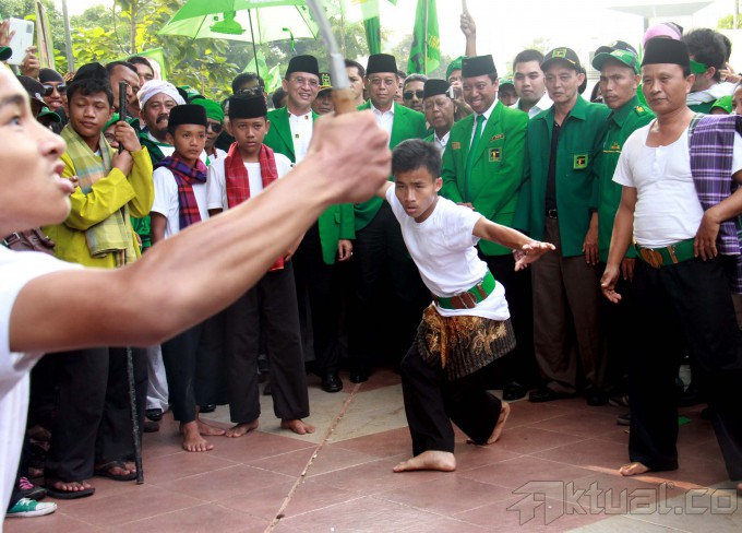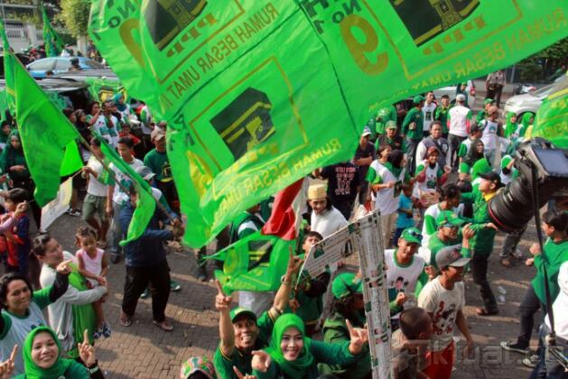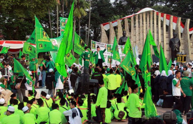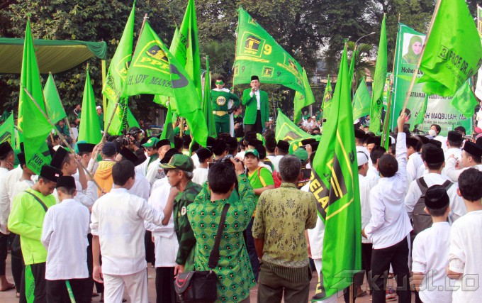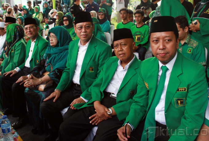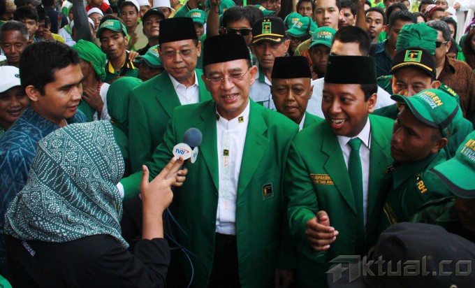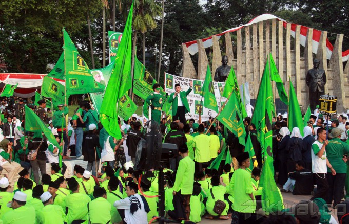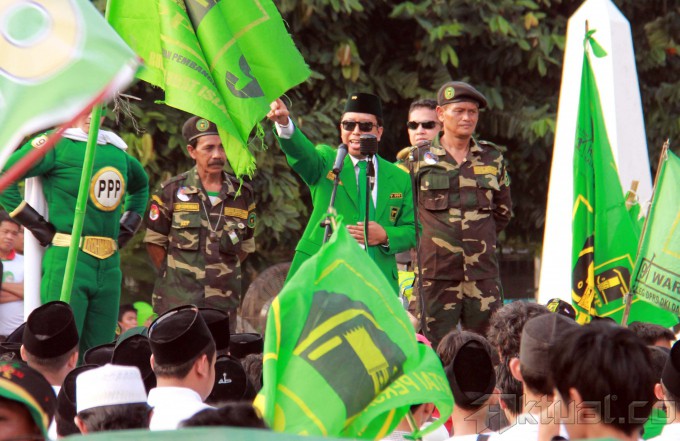 Ketua Umum Partai Persatuan Pembangunan (PPP) yang juga Capres PPP Suryadharma Ali, melakukan orasi politik dihadapan ribuan massa PPP di Tugu Proklamasi, Jakarta Pusat, Sabtu (5/4/2014). Kampanye terakhir PPP dipenuhi ribuan massa partai berlambang Ka’bah sejak siang hingga sore. Tiga panggung utama disiapkan di tengah lokasi tugu Proklamasi untuk meramaikan kampanye terakhir PPP. Aktual/Tino Oktaviano