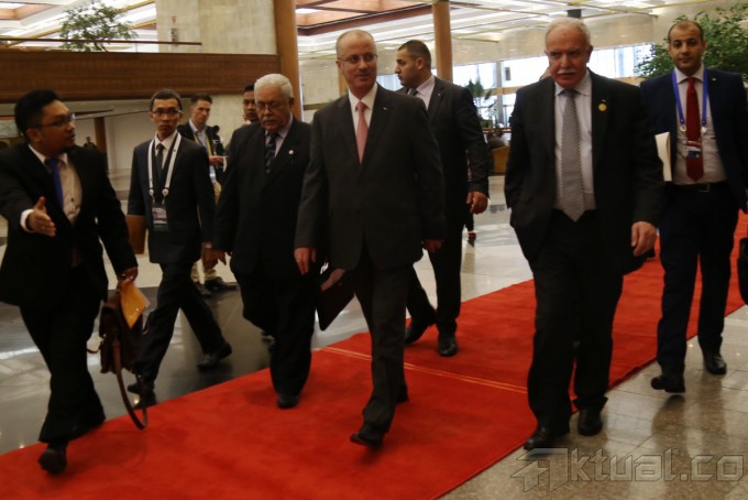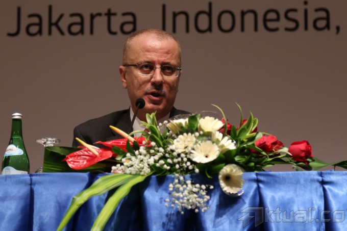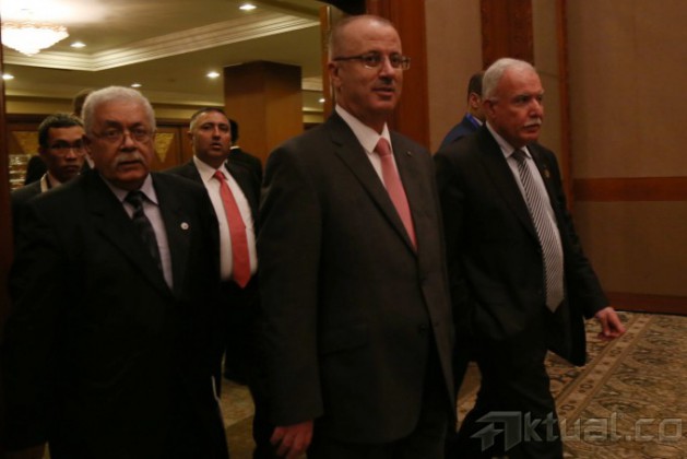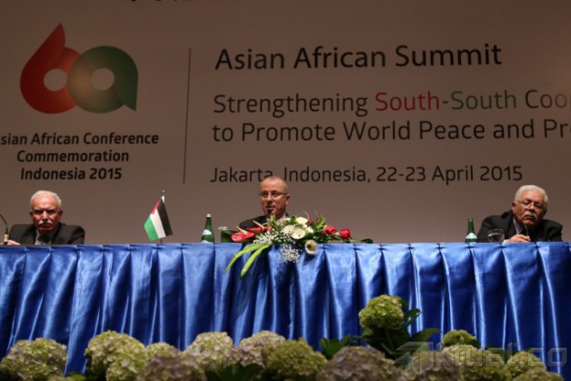 Perdana Menteri Palestina Rami Hamdalah (tengah) didampingi Menteri Luar Negeri Palestina Riyad al-Maliki dan Dubes Palestina untuk Indonesia Dubes Palestina Fariz Mehdawi (kanan) saat konpres diselapenyelenggaraan hari ketiga KAA, di Jakarta Convention Center (JCC), Selasa (21/4/2015). Perdana Menteri (PM) Palestina Rami Hamdalah mengharapkan dukungan dari Liga Arab untuk membantu proses kemerdekaan negaranya. AKTUAL/TINO OKTAVIANO
