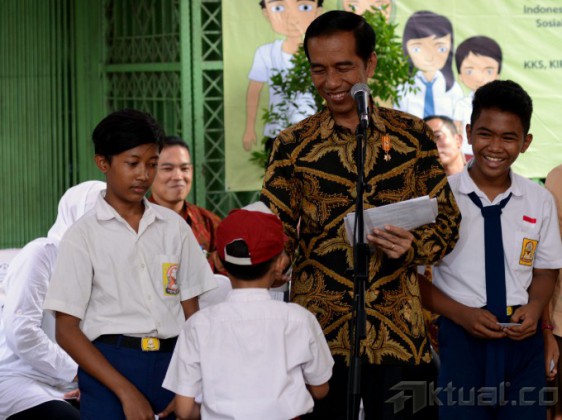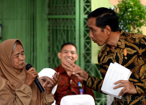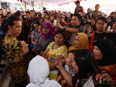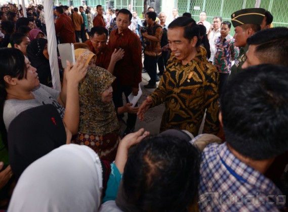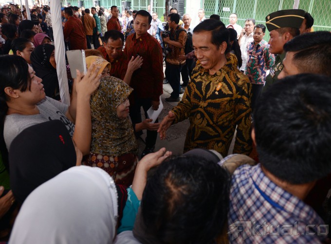 Presiden Joko Widodo (Jokowi) disambut warga saat hendak membagikan Kartu Indonesia Sehat (KIS), Kartu Indonesia Pintar (KIP), dan Kartu Keluarga Sejahtera (KKS) di Kantor Pos Kampung Melayu, Jakarta, Rabu (13/5/2015). Sejak diluncurkan pada 3 November 2014, KIS telah didistribusikan hingga 4 juta kartu di 18 kabupaten dan kota di seluruh Indonesia. AKTUAL/MUNZIR
