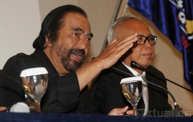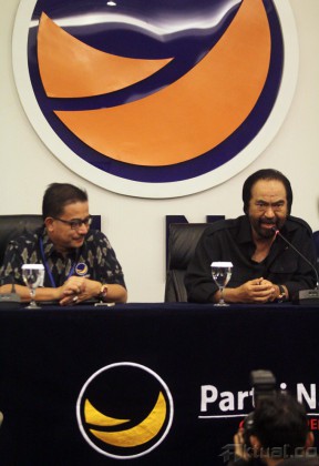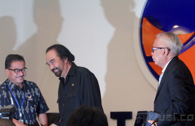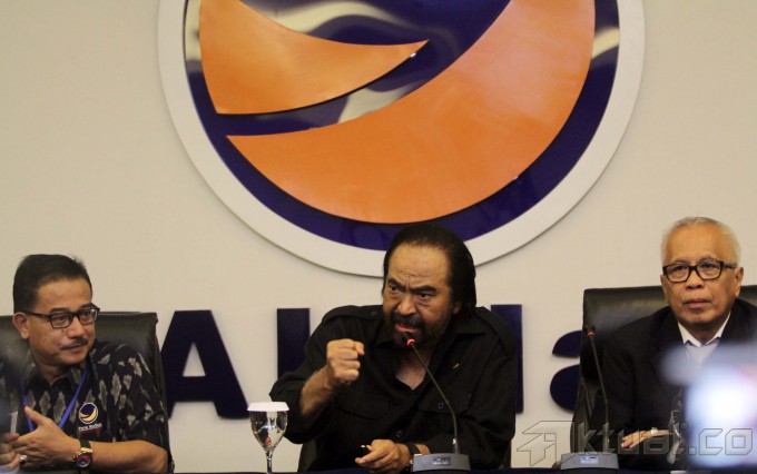 Ketua Umum Partai NasDem Surya Paloh (tengah) didampingi Ketua Bappilu Partai NasDem, Ferry Mursyidan Baldan (kiri) dan Ketua Mahkamah Partai NasDem OC Kaligis meninggalkan ruangan usai memberikan keterangan terkait terjadinya penembakan posko Caleg Partai Nasdem di Kantor DPP NasDem Jakarta, Senin (17/2/2014). Partai NasDem mendesak aparat keamanan mengusut tuntas kasus penembakan posko Nasdem di Aceh Utara yang menggunakan senjata laras panjang jenis M-16 dan A1 yang diduga bermotif politik. Aktual/Tino Oktaviano