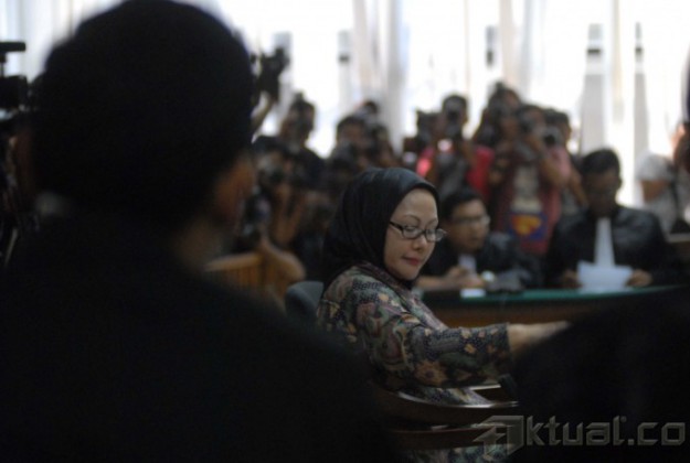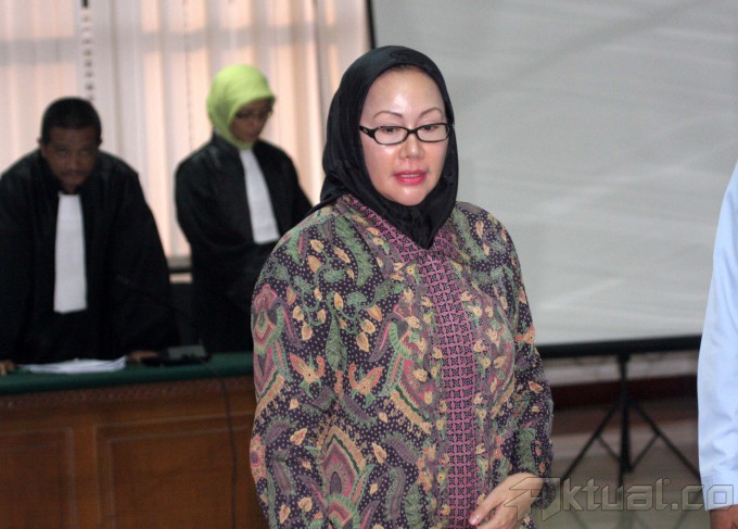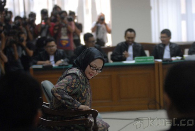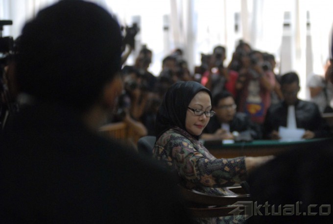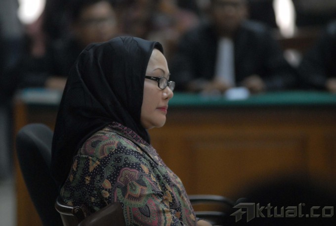 Gubernur Banten Ratu Atut non-aktif Ratu Atut Chosiyah saat menjalani sidang vonis di Pengadilan Tipikor, Jakarta, Senin (1/9/2014). Oleh Hakim Tipikor, Atut divonis 4 tahun penjara, denda Rp200 juta subsider 5 bulan kurungan karena dianggap bersalah memberikan uang Rp1 miliar kepada mantan Ketua Mahkamah Konstitusi Akil Mochtar melalui advokat Susi Tur Andayani untuk memenangkan gugatan yang diajukan pasangan Amir Hamzah dan Kasmin. Aktual/Junaidi Mahbub