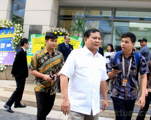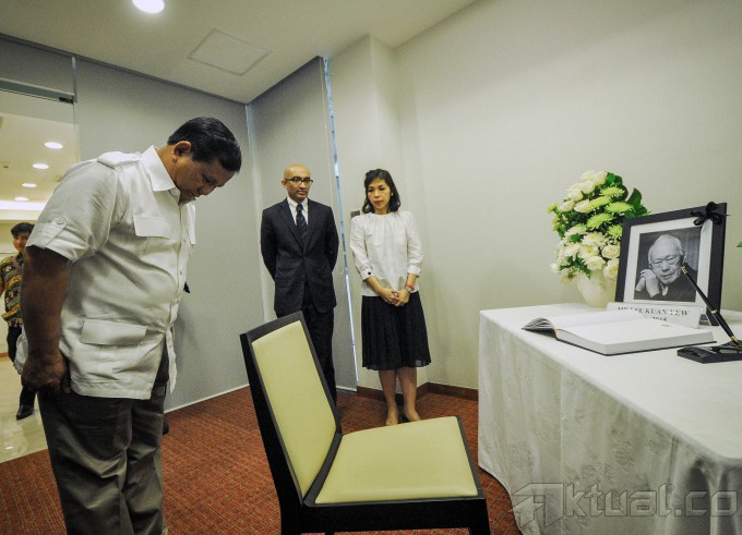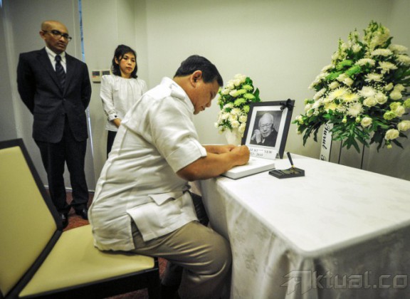 Ketua Umum Partai Gerindra Prabowo Subianto saat memberikan penghormatan terakhir kepada mantan Perdana Menteri Singapura Lee Kuan Yew, di Kedutaan Besar Singapura, Jakarta, Kamis (26/3/2015). Prabowo datang untuk mengucapkan belasungkawa kepada mantan Perdana Menteri Singapura Lee Kuan Yew. AKTUAL/MUNZIR