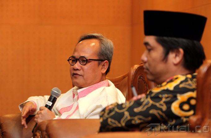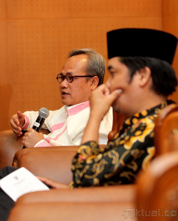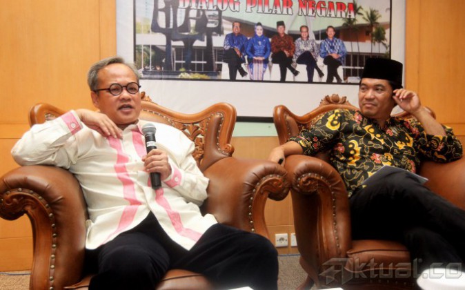 Wakil Ketua MPR RI Hajriyanto Tohari (kiri) dan Direktur Lingkar Masyarakat Madani Ray Rangkuti (kanan) menjadi pembicara pada dialog pilar negara di Gedung Parlemen, Jakarta, Senin (21/4/2014). Dialog membahas Praktek politik uang atau Money Politic dalam pemilu. Aktual/Tino Oktaviano