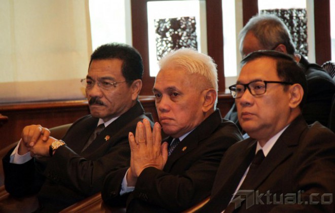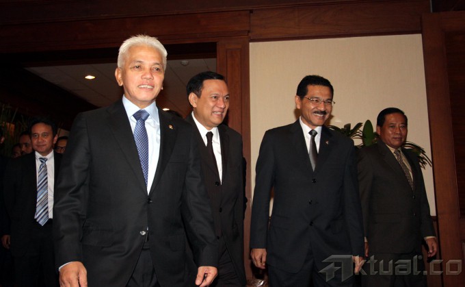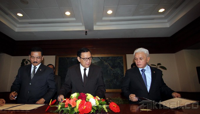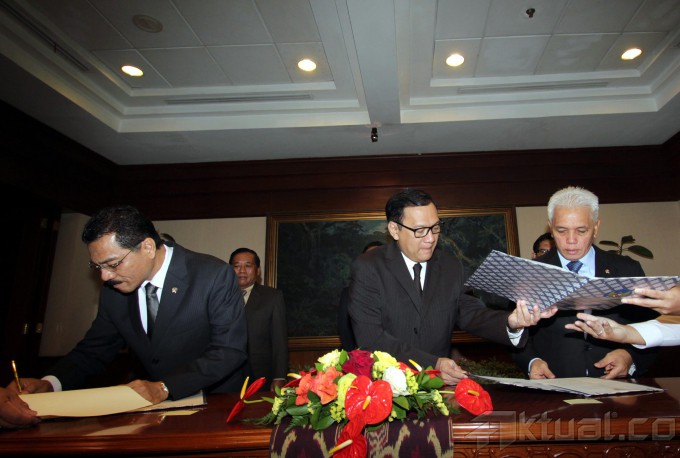 Menteri Dalam Negeri Gamawan Fauzi, Gubernur Bank Indonesia (BI) Agus DW Martowardojo dan Menko Perekonomian Hatta Rajasa (kiri kekanan) melakukan penandatanganan perjanjian kerjasama terkait pengendalian inflasi daerah dengan dua kementerian, yakni Kementerian Koordinator Bidang Perekonomian dan Kementerian Dalam Negeri di Jakarta, Senin (21/4/2014). Penandatanganan nota kesepahaman ini merupakan payung penting dalam upaya bersama terkait pengendalian inflasi, baik di tingkat nasional maupun daerah. Aktual/Tino Oktaviano