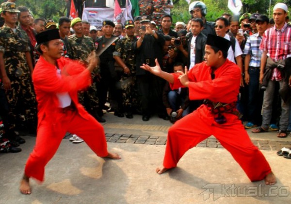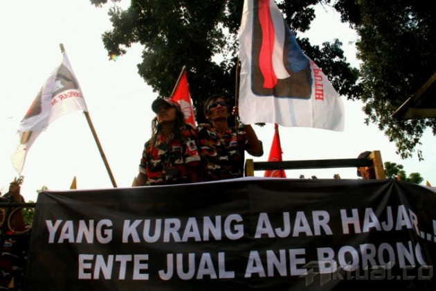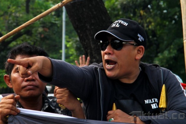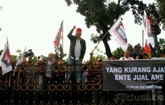 Pendemo dari Rakyat Jahit Mulut Ahok (Rajjam) melakukan teater di Balai Kota DKI Jakarta, Senin (29/7). Massa menuntut Wagub DKI Jakarta Basuki Tjahaja Purnama (Ahok) meminta maaf kepada pedagang kaki lima (PKL) di Tanah Abang. Aktual/Oke Dwi Atmaja
