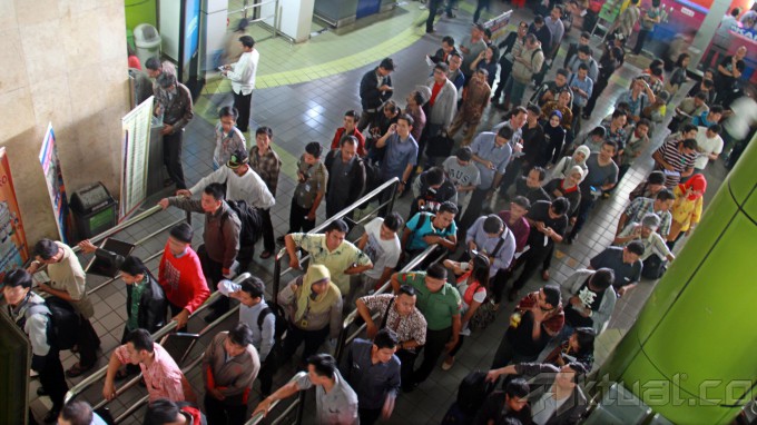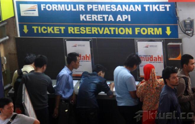Puluhan calon penumpang antri saat akan membeli tiket ketreta di loket Stasiun Gambir, Jakarta Pusat, Jumat (14/2/2014). Mayoritas mereka merupakan calon penumpang pesawat yang gagal berangkat karena gangguan abu vulkanik. Sejumlah maskapai penerbangan terpaksa menunda keberangkatan karena status sejumlah bandara saat ini ditutup untuk seluruh penerbangan. Aktual/Tino Oktaviano