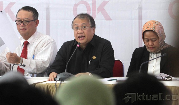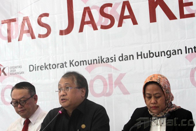 Wakil Ketua Dewan Komisioner Otoritas Jasa Keuangan (OJK) Rahmat Waluyanto (tengah) didampingi Deputi Komisioner OJK Lucky Fathul A Hadibrata (kiri), dan Deputi Komisioner Manajemen Strategis II B Harti Haryanti (kanan) memberikan keterangan terkait sosialisasi tentang Aturan Pelaksanaan Pungutan OJK di Jakarta, Kamis (3/4/2014). Menurut OJK, pungutan yang diwajibkan kepada industri jasa keuangan ini diyakini dapat dirasakan manfaatnya kembali oleh industri dengan berbagai program kerja OJK yang bernilai tambah pada bidang pengaturan dan pengawasan terintegrasi serta perlindungan konsumen dan good governance. Aktual/Tino Oktaviano