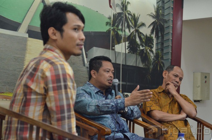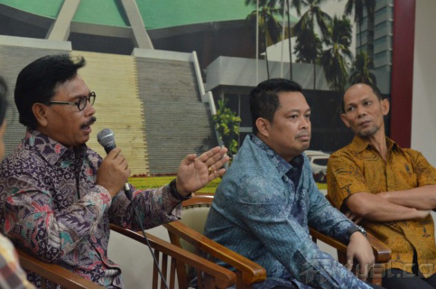 (dari kiri) Sekertaris Partai Nasdem Jhony G Plate, Wakil Ketua MPR Mahyudin dan Pengamat Ekonomi Politik Ichsanuddin Noorsy menjadi narasumber pada Dialektika Demokrasi di Pressroom DPR, Kompleks Perlemen Senayan, Jakarta Selatan, Kamis (19/3/2015). Dialog ini membahas nilai Rupiah yang anjlok terhadap dollar AS di tahun ini dengan tajuk “Rupiah Terpuruk dan Dampaknya bagi Perekonomian Indonesia”. AKTUAL/JUNAIDI MAHBUB