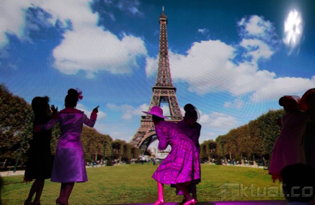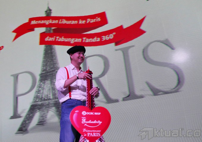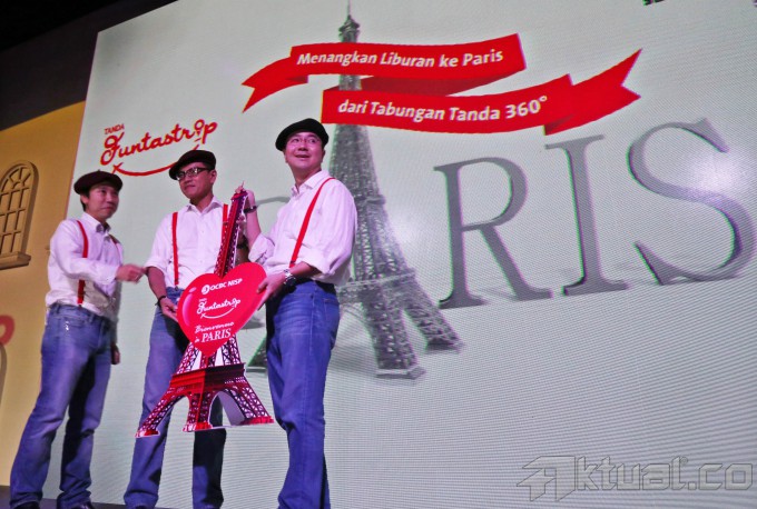 Direktur Consumer Banking Bank OCBC NISP Andrae Krsihnawan (tengah) bersama Senior Corporate Executive Ka Jit (kanan) dan Consumer Marketing & Strategy Division Head Andreas Kurniawan, menunjukkan replika menara Eiffel pada peluncuran program tabungan Tanda Funtastrip 2015 di Jakarta, Rabu (15/4/2015). Program yang berlangsung 15 April – 30 September 2015 tersebut berhadiah utama paket liburan keluarga ke Paris, dan hadiah-hadiah lainnya berupa puluhan gadget terbaru. AKTUAL/TINO OKTAVIANO