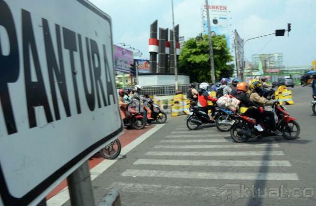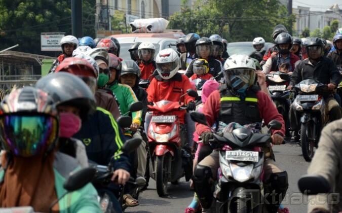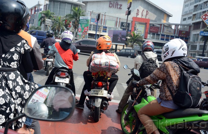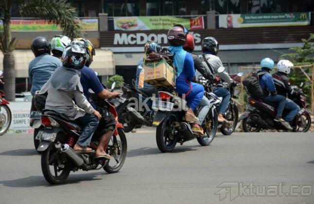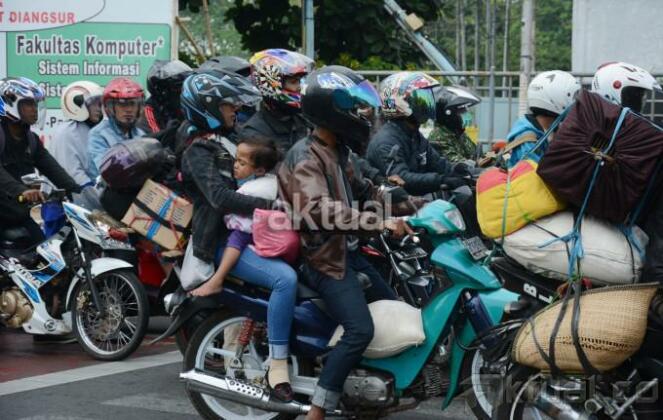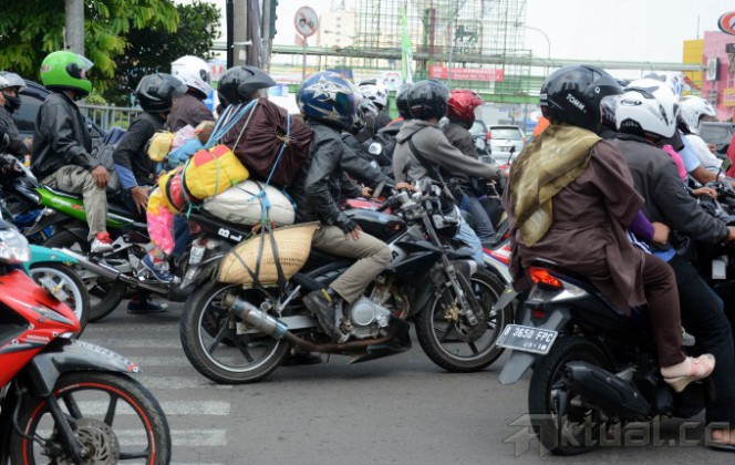 Pemudik sepeda motor memasuki kota Jakarta di kawasan jalan Kalimalang, Bekasi, Jawa Barat, Minggu (3/8/2014). Arus balik yang menggunakan sepeda motor menuju arah Jakarta dan sekitarnya “menguasai” jalan arteri Kalimalang pada H+6 Lebaran. Banyaknya pemudik arus balik bermotor arah Jakarta sudah terlihat selepas kota Bekasi, umumnya mereka membawa barang bawaan yang disimpan pada bagian belakang atau depan kendaraan sepeda motornya. Aktual/Tino Oktaviano