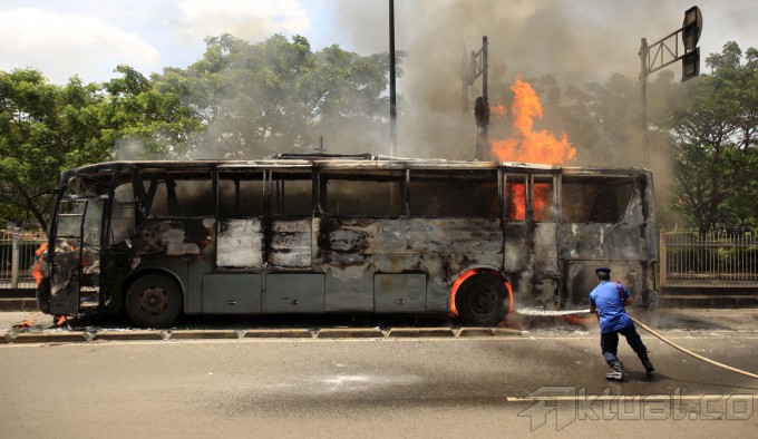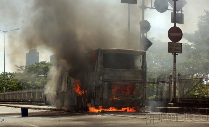 Sebuah TransJakarta nomor polisi B7494IX terbakar hebat di depan Pasar Rumput, Jakarta Selatan, Selasa (8/4/2014). Kebakaran tersebut diduga dari konsleting mesin. Tidak ada korban jiwa dalam kebakaran tersebut, hanya mengakibatkan kemacetan karena Jalan Sultan Agung yang terdapat di depan Pasar Rumput sempat ditutup. Aktual/Tino Oktaviano