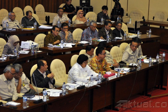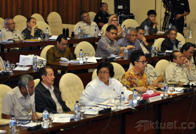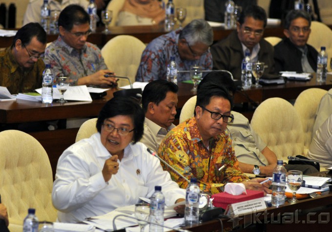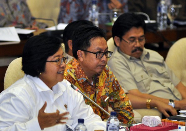 Menteri Lingkungan Hidup dan Kehutanan RI Siti Nurbaya Bakar mengikuti rapat kerja dengan Komisi IV, di Kompleks Paremen Senayan, Jakarta Selatan, Senin (25/5/2015). Raker tersebut membahas perburuan dan perdagangan ilegal satwa langka yang dilindungi juga sumber daya alam. AKTUAL/JUNAIDI MAHBUB