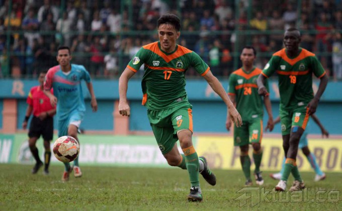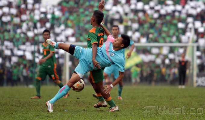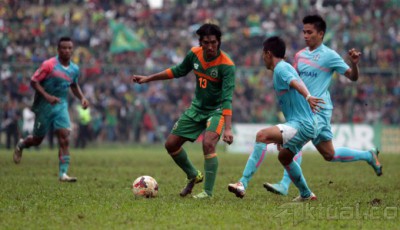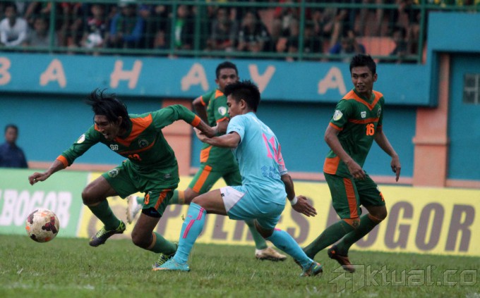 Pesepakbola Persikabo Kabupaten Bogor Budi Sudarsono (13) dikepung pemain PS Bangka dalam laga Divisi Utama distadion Persikabo kabupaten Bogor, Jawa Barat (6/5/2014). Persikabo bermain imbang lawan PS Bangka dengan skor imbang 1-1. Aktual/Bagas Triputro