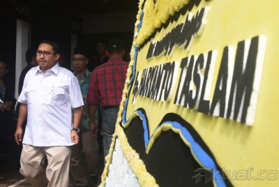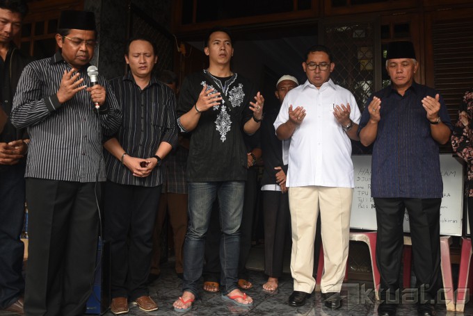 Wakil Ketua Umum Partai Gerindra Fadli Zon mengunjungi rumah duka Haryanto Taslam di Duren Sawit, Jakarta, Minggu (15/3). Sejumlah tokoh politik mendatangi rumah duka Haryanto untuk memberikan rasa bela sungkawa kepada keluarga politisi senior Partai Gerinda itu. ANTARA FOTO/Hafidz Mubarak A