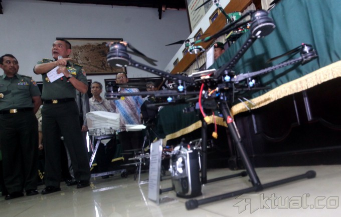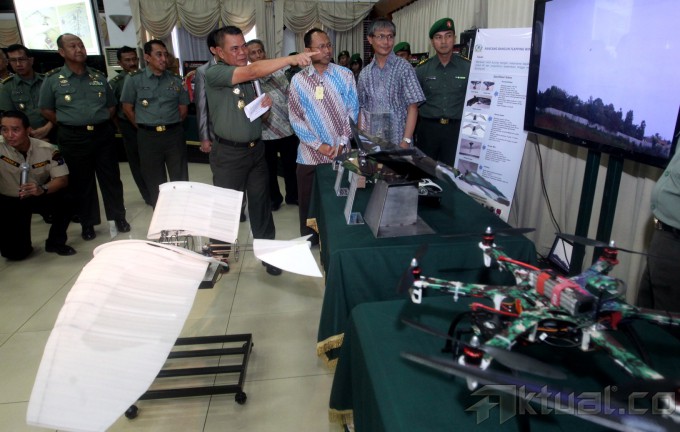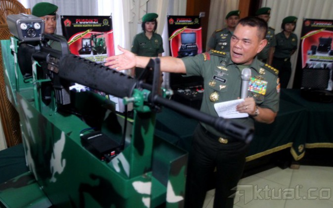Kepala Staf Angkatan Darat (Kasad) Jenderal (TNI) Budiman memberikan penjelasan tentang perlengkapan militer saat pameran hasil riset berbasis teknologi di Mabes TNI AD, Jakarta, Senin (7/4/204). Melalui pengembanagan riset tersebut diharapkan dapat mengembangkan alat utama sistem pertahanan (alutsista) sehingga militer Indonesia tak perlu bergantung dengan negara lain. Aktual/Tino Oktaviano