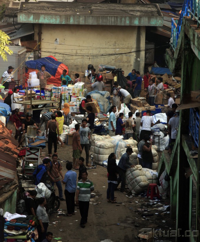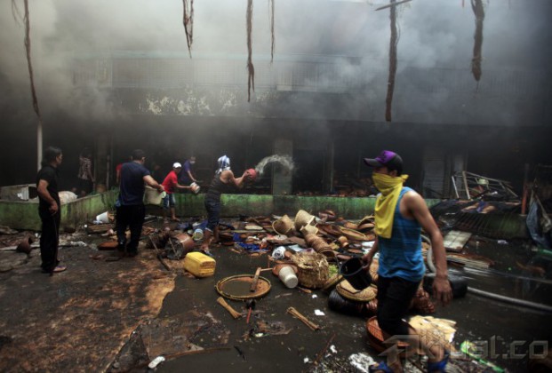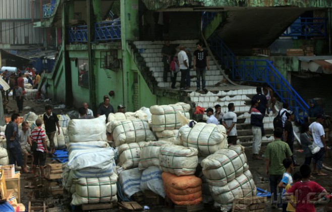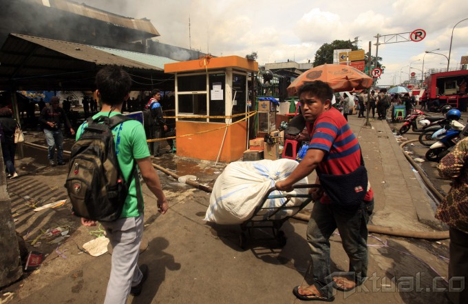 Pedagang menyelamatkan dagangannya saat terjadi kebakaran di pasar Senen, Jakarta Pusat, Jumat (25/4/2014). Kebakaran yang membakar ribuan kios pedagang tersebut belum diketahui penyebabnya dan kerugiannya. Aktual/Tino Oktaviano
