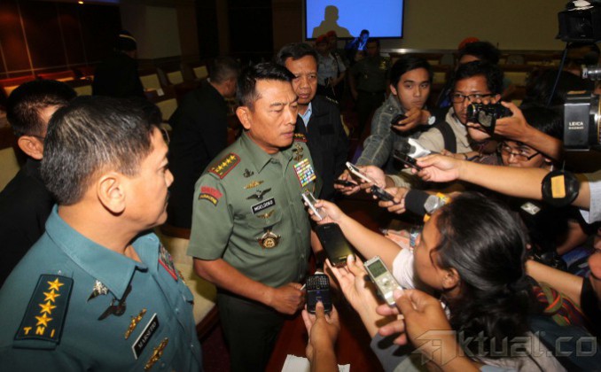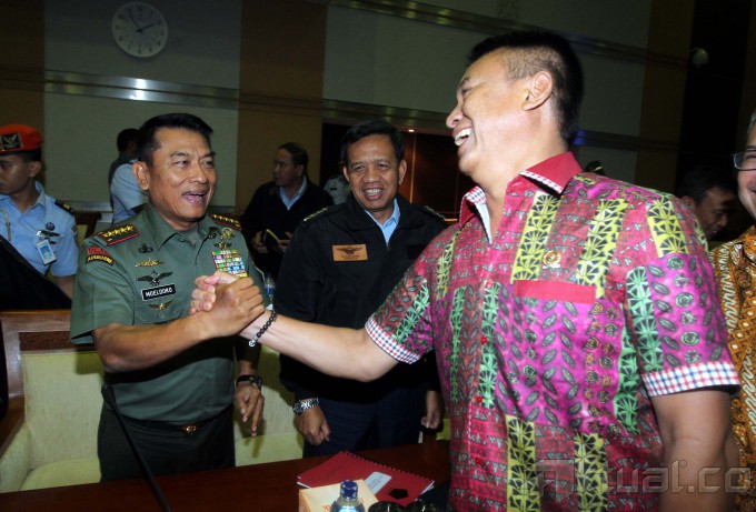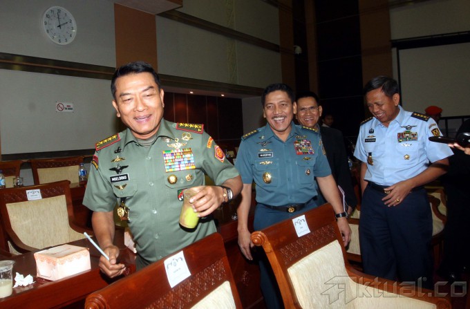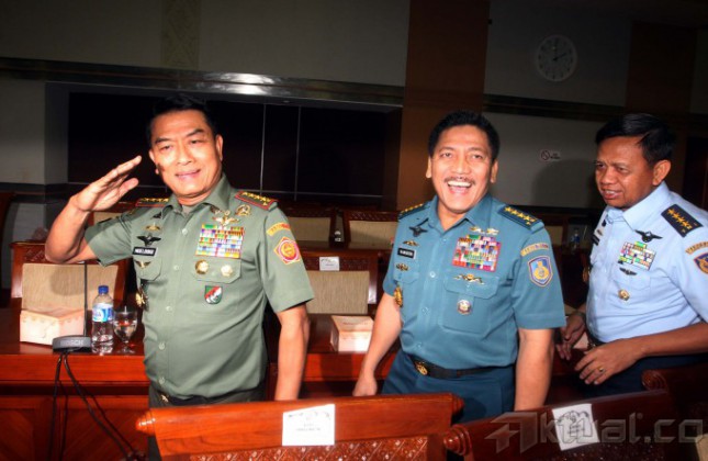 Panglima TNI Jenderal TNI Moeldoko (kiri), KASAL Laksamana TNI Marsetio (tengah) dan KASAU Marsekal TNI Ida Bagus Putu Dunia (kanan) menyapa usai rapat tertutup bersama Komisi I DPR di Gedung Parlemen, Jakarta, Senin (10/2/2014). Panglima TNI Jenderal Moeldoko memastikan tak akan mengubah nama KRI Usman-Harun meskipun Singapura melayangkan protes penamaan KRI itu. Ia mengatakan, pemberian nama KRI telah melalui proses panjang sebelum adanya protes dari Singapura. Aktual/Tino Oktaviano
