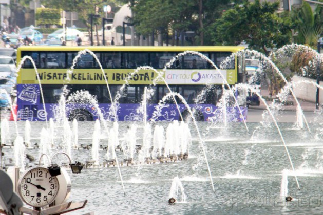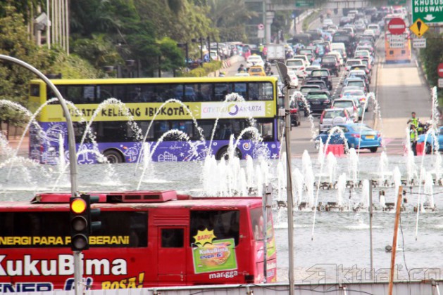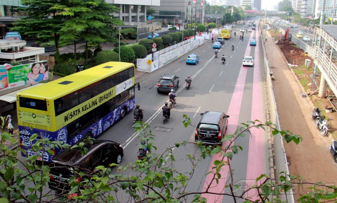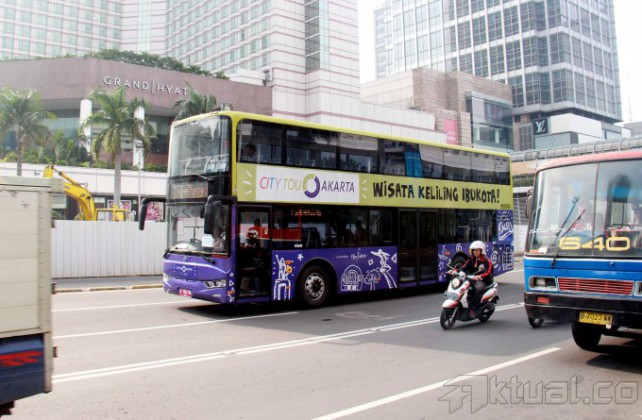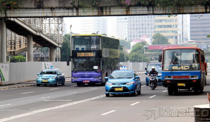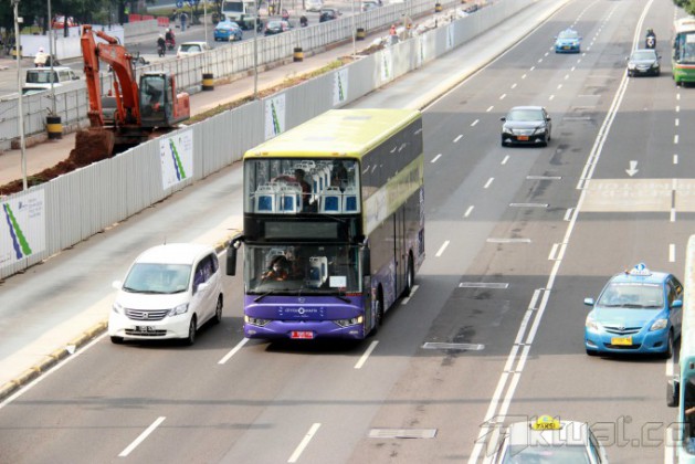 Sebuah bus pariwisata tingkat melakukan uji coba di jalan MH Thamrin, Jakarta Pusat, Rabu (19/2/2014). 5 Unit bus pariwisata tingkat milik Pemprov DKI Jakarta melakukan uji coba dan rencananya bus tingkat buatan China itu akan mulai beroperasi mulai Senin (24/2/2014) nanti. Aktual/Tino Oktaviano