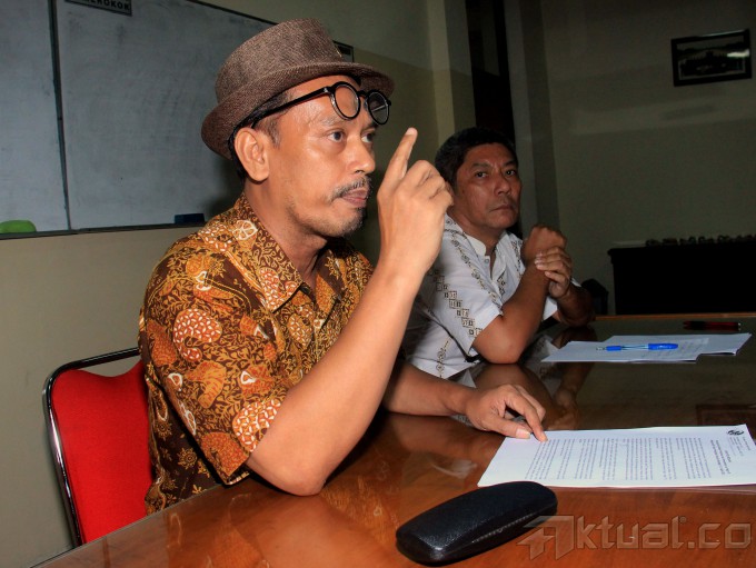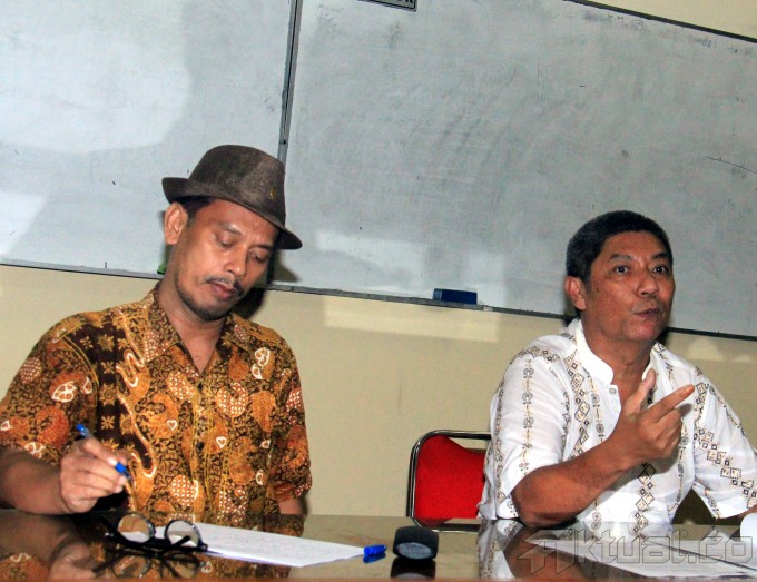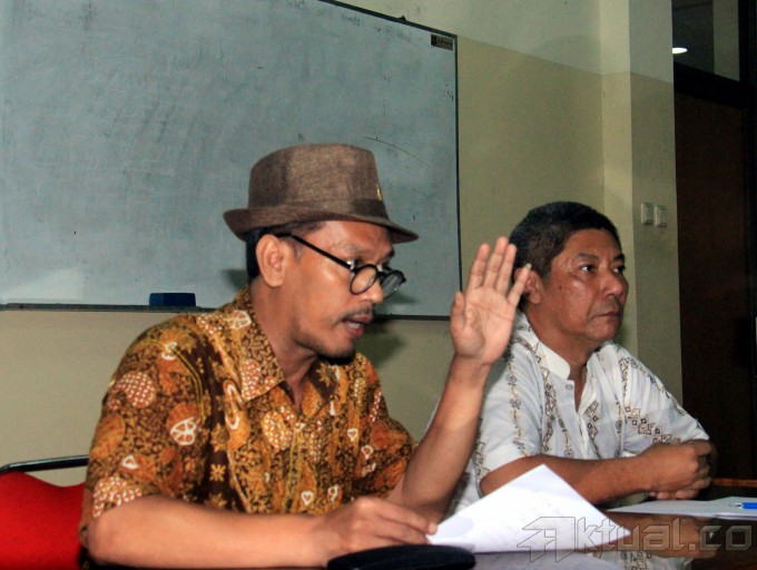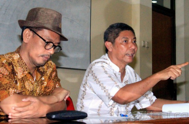 Direktur Global Future Institute Hendrajit (kanan) bersama Ketua Dewan Pakar PA GMNI Jakarat Raya Giat Wahyudi (kiri) saat jumpa pers di kantor Global Futuer Institute, Jalan Dharmawangsa, Jakarta Selatan, Senin (13/4/2015). Hendrajit meminta penjelasan dari Kementrian Luar Negeri RI terkait 60 tahun Peringatan Dasasila Bandung 18-24 April 2015. AKTUAL/MUNZIR