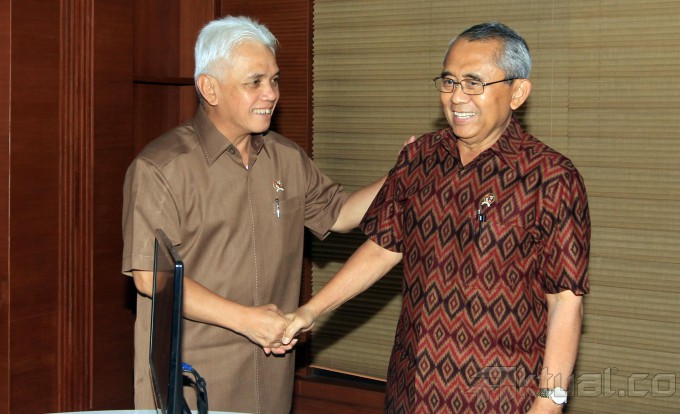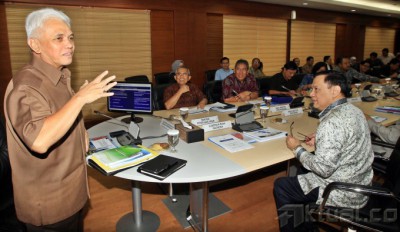Menko Perekonomian Hatta Rajasa (kiri) berbincang santai bersama sejumlah menteri ekonomi termasuk Gubernur Bank Indonesia Agus Martowardojo menyambut kedatangan Menteri Pekerjaan Umum Djoko Kirmanto dalam rapat koordinasi (Rakor) di Kantor Menko Perekonomian, Jakarta, Kamis (6/2). Rapat koordinasi ini membahas beberapa permasalahan di antaranya mengenai ketersediaan pangan dan infrastruktur jalan yang rusak pascabanjir. Aktual/Tino Oktaviano