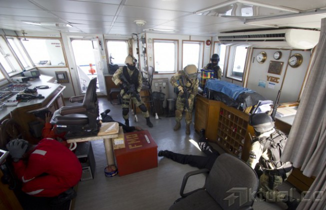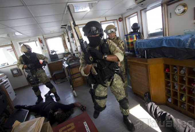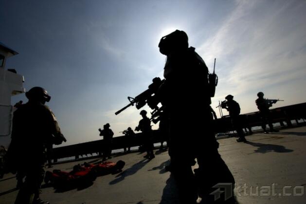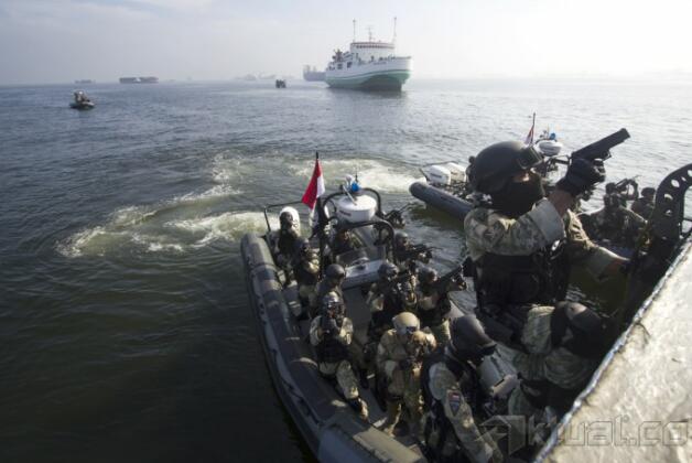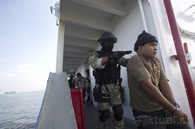 Sejumlah anggota Komando Pasukan Katak mengikuti simulasi pembebasan sandera pada sebuah kapal yang dibajak di Laut Jakarta, Senin (6/4). Simulasi itu dilakukan dalam rangkaian upacara penyematan brevet kehormatan kepada Panglima Komando Armada RI Kawasan Barat dan Panglima Komando Armada RI Kawasan Timur. ANTARA FOTO/Vitalis Yogi Trisna