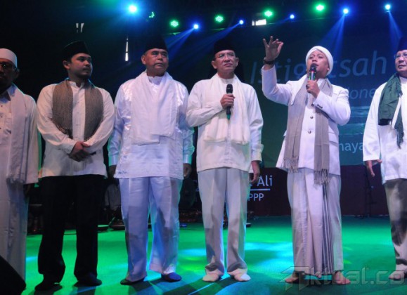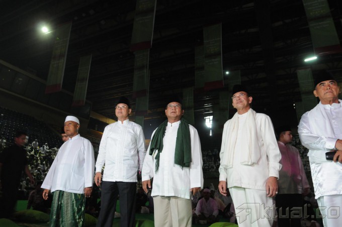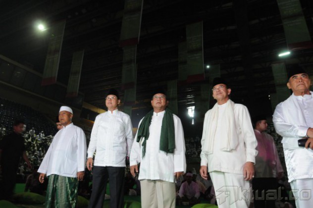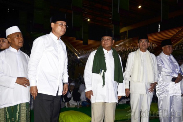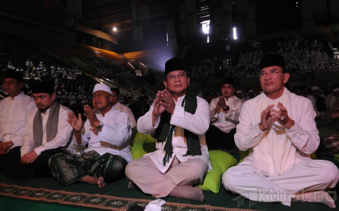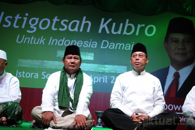 Capres dari Partai Gerindra Prabowo Subianto (kedua kanan) bersama Ketua PPP Suryadharma Ali (kanan) menghadiri istighosah Kubro yang diadakan oleh PPP di Istora Senayan Jakarta, Jumat (4/4/2014). Istighosah Kubro untuk Indonesia damai tersebut dihadiri ribuan peserta yang berasal dari sejumlah daerah di DKI Jakarta. Aktual/Tino Oktaviano