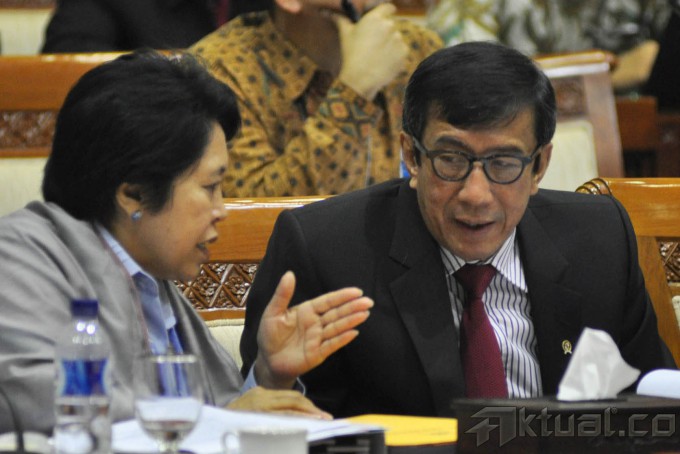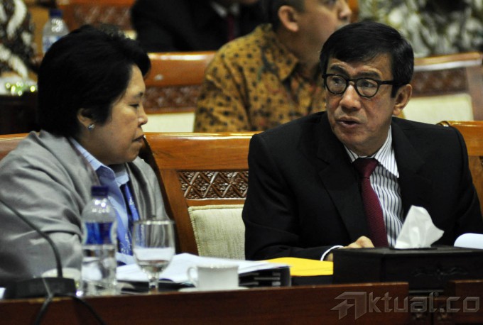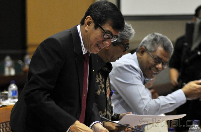 Menkum HAM Yasonna Laoly berbincang dengan stafnya disela Rapat Kerja dengan Komisi I DPR RI di Gedung Parlemen Senayan, Jakarta, Senin Rapat kerja tersebut membahas penjelasan Pemerintah dan pengambilan keputusan terhadap RUU tentang Perjanjian Ekstradisi antara RI- Papua Nugini dan RI-Vietnam. AKTUL/JUNAIDI MAHBUB