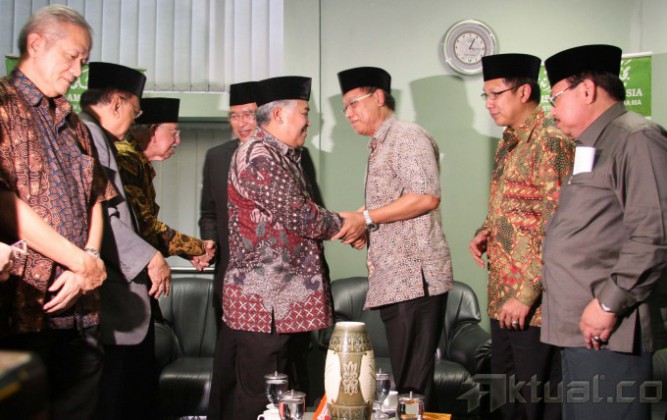 Ketua Umum Partai Persatuan Pembangunan (PPP) Suryadharma Ali didampingi Wakil Ketua Dewan Syuro Djan Farid dan Wakil Ketua PPP Lukman Hakim, bertemu Ketua Majelis Ulama Indonesia (MUI) Din samsudin saat menyambangi kantor MUI di Jalan Proklamasi Jakarta Pusat, Kamis (20/3/2014). Kedatangan petinggi PPP ini meminta Ketua MUI untuk bertemu dengan kader PPP, karena Ketua MUI tersebut punya pemikiran yang kita hormati, perspektif jauh ke depan. Apakah agama, politik dan sering kita dengar. Aktual/Tino Oktaviano