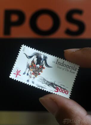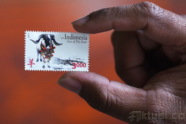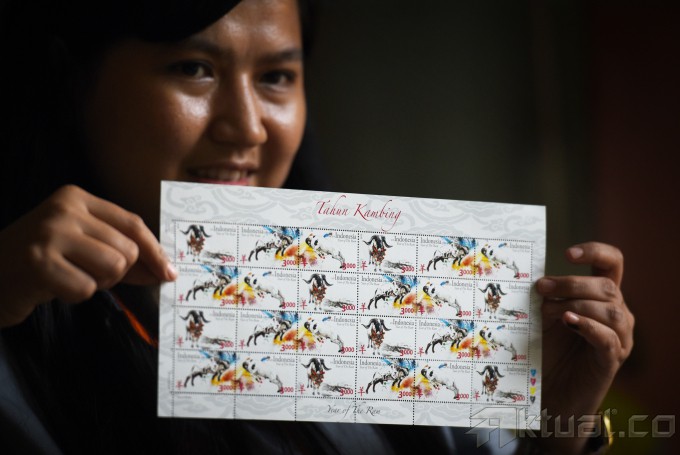 Petugas menunjukan prangko seri tahun kambing yang diterbitkan PT Pos Indonesia di kantor Filateli Jakarta, Rabu (4/2/2015). Penerbitan prangko tersebut dalam rangka menyambut tahun kambing dalam penanggalan Tiongkok. ANTARA FOTO/Zabur Karuru