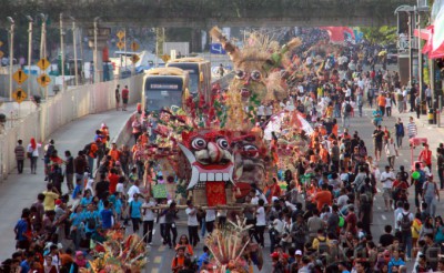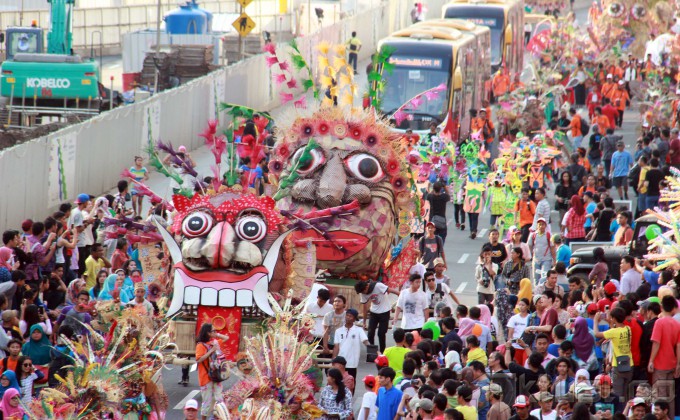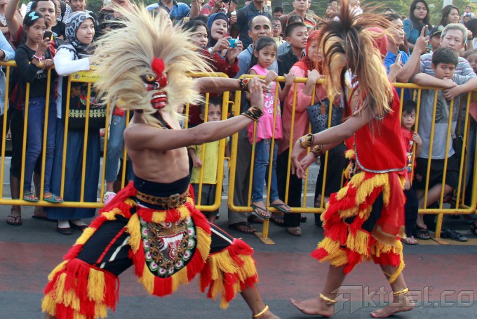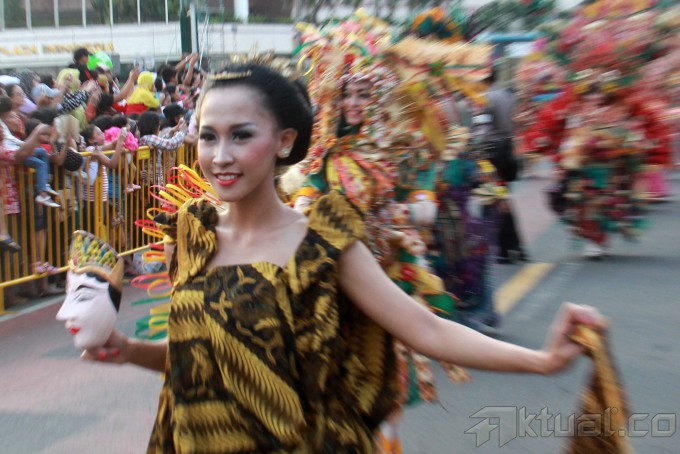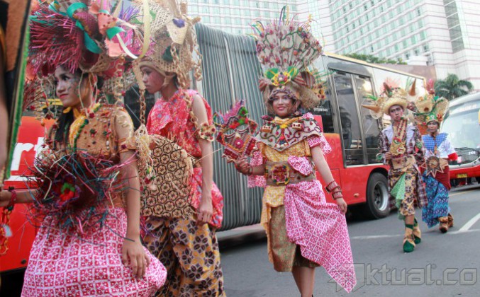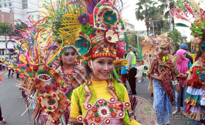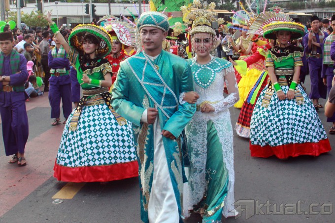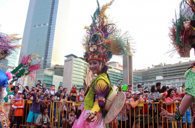 Sejumlah penari memeriahkan pawai Jak Karnaval 2014 di sepanjang Jalan HM Thamrin, Jakarta Pusat, Minggu (22/6/2014). Jak Karnaval tahun ini bertemakan “Keajaiban Topeng Nusantara” diramaikan oleh 1,200 orang arak-arakan berjalan kaki dan 25 unit mobil kreatif hias topeng nusantara. Aktual/Tino Oktaviano