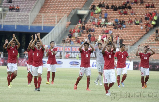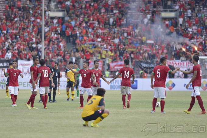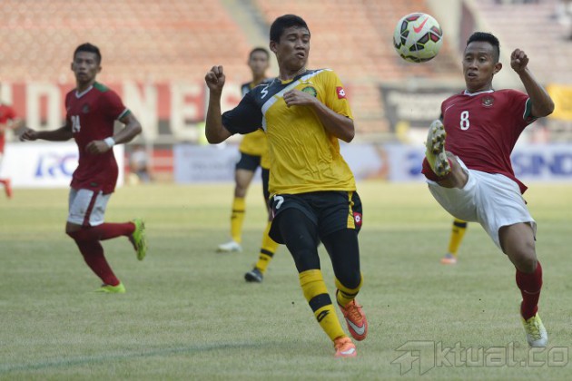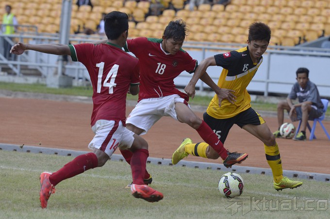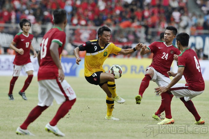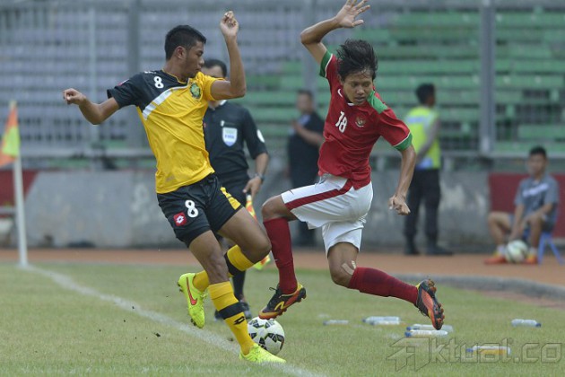 Pesepak bola Timnas Indonesia U-23 Antoni Putro Nugroho (kanan) berebut bola dengan Pesepak bola Timnas Brunei Darussalam U-23 Suhaimi Anak Salau (kedua kanan) pada pertandingan kualifikasi Grup H Kejuaraan Piala Asia (AFC) U-23 Tahun 2016 di Stadion Utama Gelora Bung Karno, Senayan, Jakarta, Minggu (29/3). ANTARA FOTO/Widodo S. Jusuf/