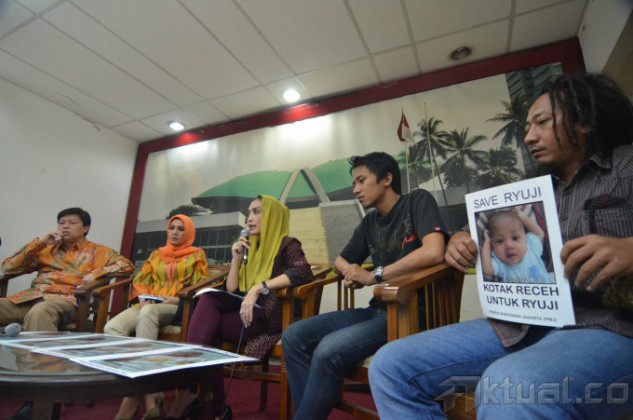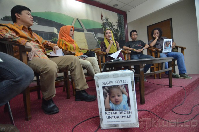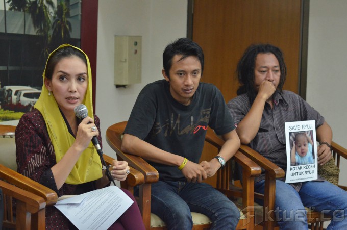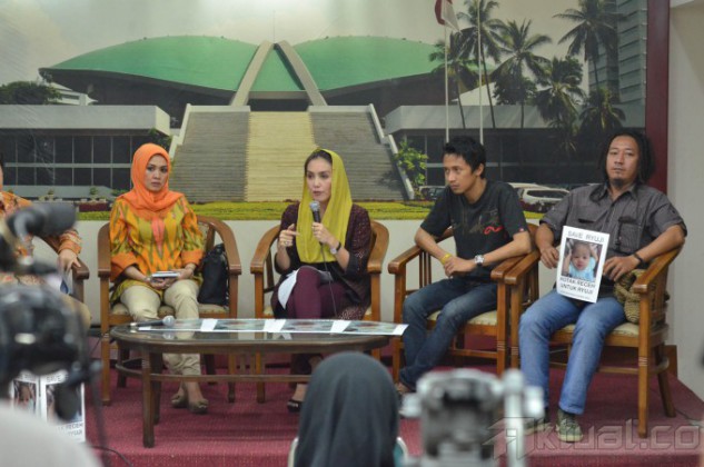 Anggota DPR Fraksi PDIP Rieke Diah Pitaloka berdialog dengan Ayah pasien Ryuji Marhaenis Kaizan, Ferry dalam pengumpulan dana Rp 1,2 miliar, di ruang press room DPR Jakarta, Jumat (6/2/2015). Ryuji Marhaenis Kaizan seorang bayi berumur 5 bulan yang menderita gangguan fungsi hati. AKTUAL/JUNAIDI MAHBUB