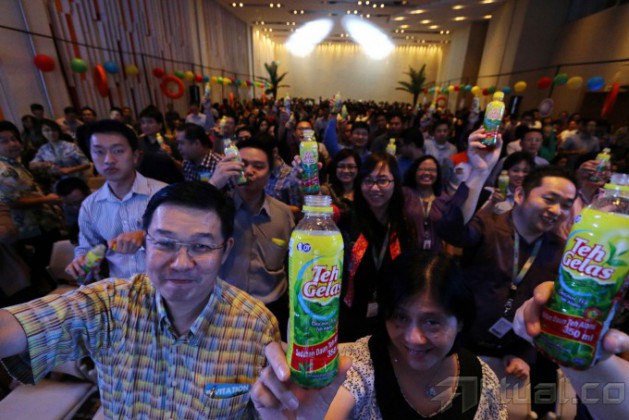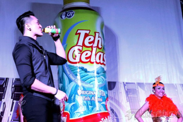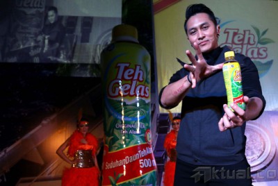 Entertaimen sekaligus magician Demian Aditya menunjukkan Teh Gelas dengan kemasan PET (botol plastik) saat peluncuran perdananya di Jakarta, Minggu, (22/6/2014). Teh Gelas terus melakukan inovasi dengan meluncurkan kemasan PET (botol plastik) guna kebutuhan masyarakat yang mudah dan praktis dibawa kemana-mana. Aktual/Ist
