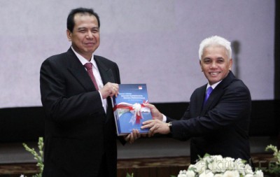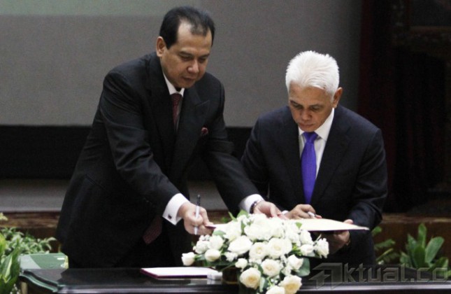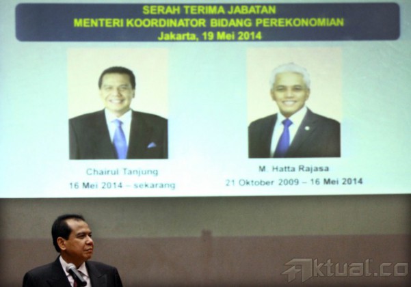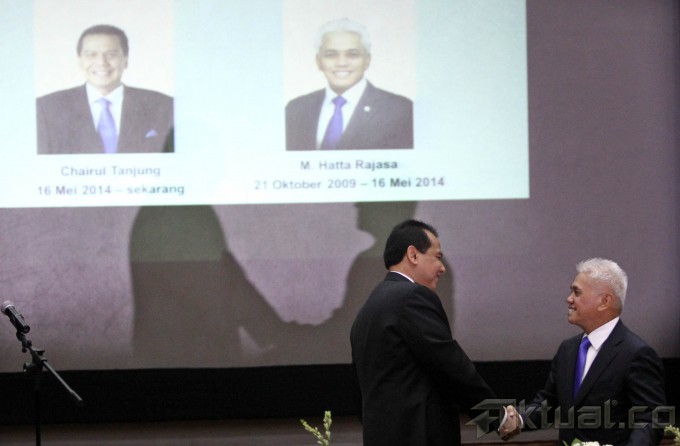 Menteri Koordinator Perekonomian Hatta Rajasa (kanan) serahterimakan jabatannya kepada Chairul Tanjung yang ditunjuk Presiden RI, saat sertijab di kantor Menko Perekonomian, Jakarta, Senin, (19/5/2014). Sertijab ini dilakukan di Gedung Graha Sawala di Gedung Kemenko Perekonomian yang berada di kawasan Lapangan Banteng Timur. Aktual/Tino Oktaviano