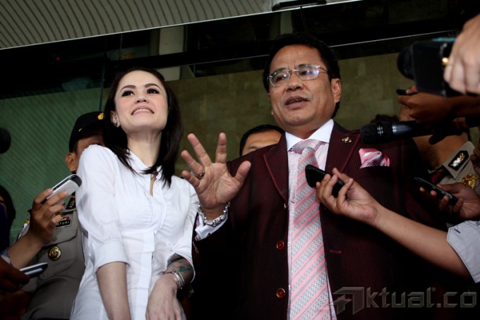 Artis Jennifer Dunn didampingi kuasa hukumnya Hotman Paris Hutapea menjawab pertanyaan wartawan usai menjalani pemeriksaan sebagai saksi dugaan tindak pidana pencucian uang untuk tersangka Tubagus Chaeri Wardana di Gedung KPK Jakarta, Jumat (14/2/2014). Jennifer mengaku diperiksa sebatas pemberian mobil Toyota Vellfire putih nomor polisi B 510 JDC dari wawan agar dia mau masuk ke rumah produksi milik wawan bernama R-One. Aktual/Tino Oktaviano