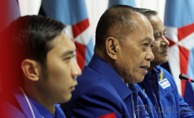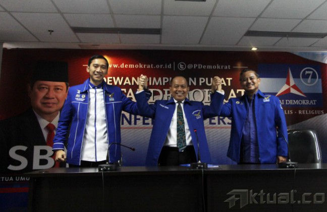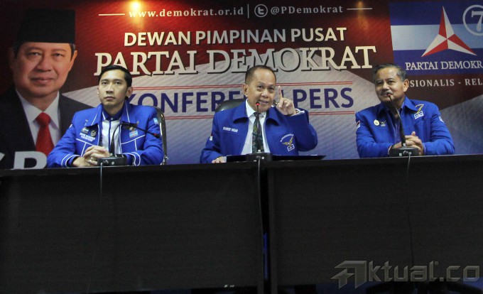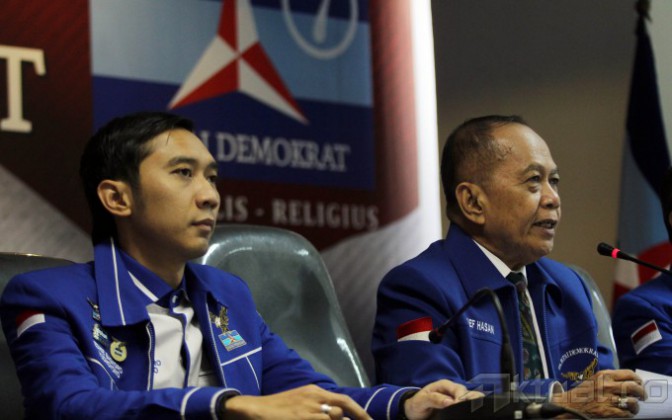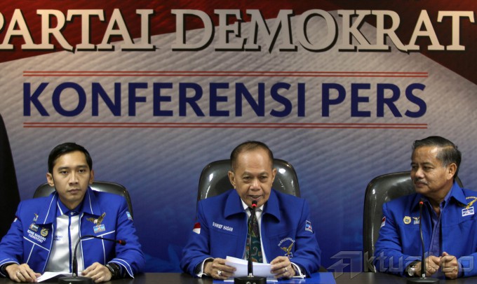 Ketua Harian DPP Partai Demokrat Syarief Hasan (tengah) didampingi Sekjen Partai Demokrat Edhie Baskoro Yudhoyono (kiri) dan Direktur Eksekutif Toto Riyanto (kanan) memberikan keterangan pers tentang sikap Partai di Jakarta, Selasa (20/5/2014). Partai Demokrat secara definitif memutuskan untuk bersikap netral dan tidak berkoalisi dengan Partai manapun. Aktual/Tino Oktaviano