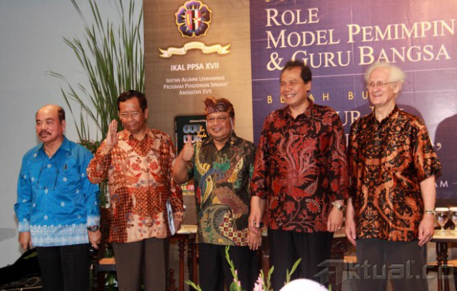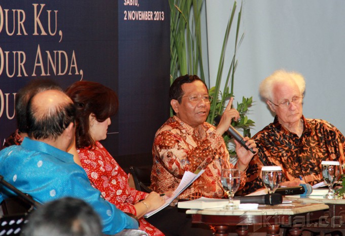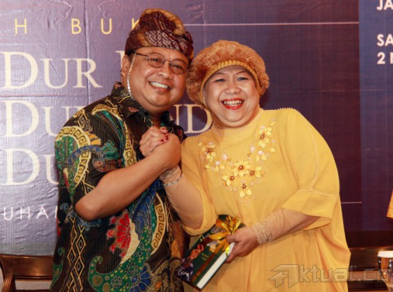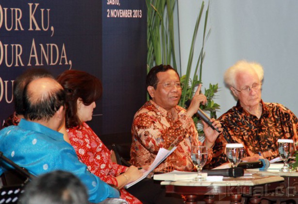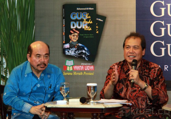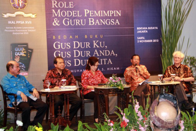 Penulis buku ‘Gus Dur Ku, Anda, Kita’ Mohammad AS Hikam (kiri) memberikan buku kepada Mantan Menteri Perhubungan Agum Gumelar (kanan) saat acara Seminar Role Model Pemimpin dan Bapak Bangsa serta Bedah Buku ‘Gus Dur Ku, Anda, Kita’ di Bentara Budaya, Palmerah, Jakarta Barat, Sabtu (2/11/2013). Agum mengakui Indonesia pada 2014 mendatang membutuhkan presiden yang tegas. Karakter itu sebagai antitesa dari kepemimpinan sekarang yang kurang tegas. presiden Indonesia 2014 juga harus mempunyai tekad kuat dan kebijaksanaan melanjutkan apa-apa yang baik dari pendahulunya, dan meninggalkan apa-apa yang buruk dari pendahulunya tanpa gembar gembor, atau menghujat. Aktual/Tino Oktaviano