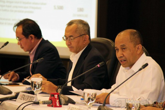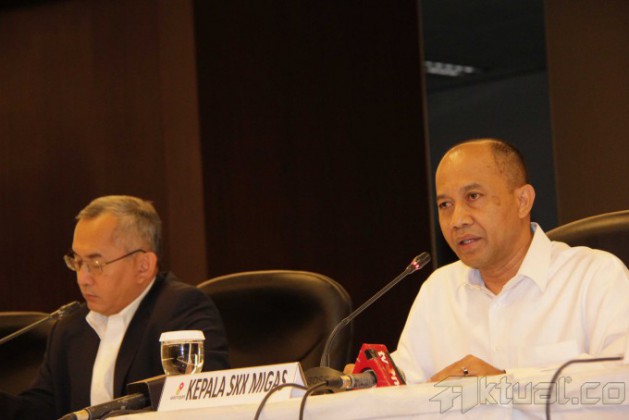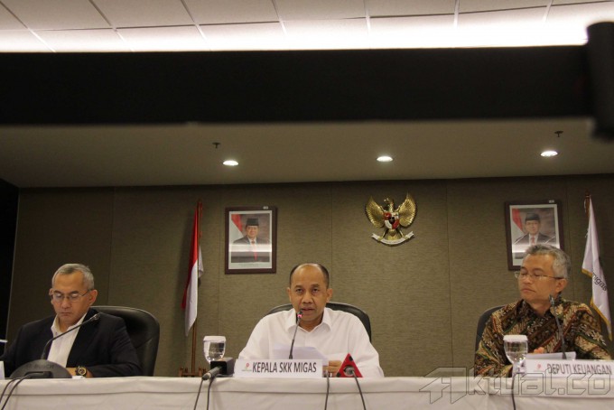 Plt Kepala Satuan Kerja Khusus Pelaksana Kegiatan Usaha Hulu Minyak dan Gas Bumi (SKK Migas) Johanes Widjonarko (tengah), didampingi Deputi Pengendalian Operasi SKK Migas Muliawan Haji (kiri) dan Deputi Pengendalian Perencanaan SKK Migas Aussie B Gautama memberikan keterangan pers refleksi akhir tahun SKK migas di Kantor SKK Migas, Jakarta, Senin (30/12/2013). Industri hulu migas membukukan penerimaan negara sebesar US$ 31,315 miliar di sepanjang tahun 2013. Penerimaan negara tersebut adalah sebesar 99 persen dari target penerimaan negara yang tercantum dalamm APBN-P 2013 yaitu sebesar US$ miliar. Aktual/Tino Oktaviano