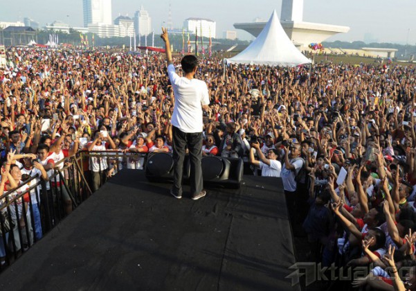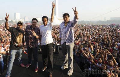 Capres Joko Widodo didampingi Ketua Taruna Merah Putih DKI Jakarta, Charles Honoris, Anggota Tim Pemenangan Jokowi-JK, Maruarar Sirait dan Artis Edo Kondologit saat acara kegiatan Gerak Jalan Revolusi Mental di Lapangan Monas, Jakarta, Minggu (22/6/2014). Kegiatan untuk memperingati HUT DKI Jakarta ke-487 ini diselenggarakan oleh DPP Taruna Merah Putih. Aktual/Tino Oktaviano