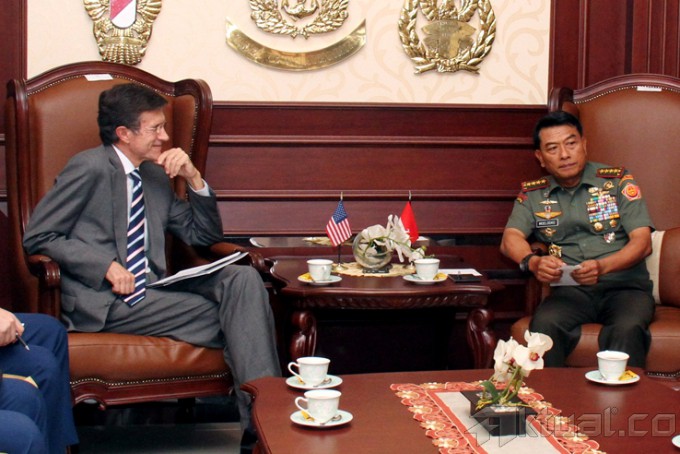 Militer Indonesia dan Amerika Serikat sepakat perangi ISIS (Islamic State of Iraq and Syria) hal ini ditegaskan oleh Panglima TNI Jenderal TNI Dr. Moeldoko saat menerima kunjungan Duta Besar (Dubes) Amerika Serikat Mr. Robert O. Blake beserta Staf, di ruang tamu Panglima TNI Jl. Merdeka Barat No. 2 Jakarta Pusat, Rabu (18/3/2015). Serta peningkatan kerjasama militer kedua negara yang selama ini telah berjalan dengan baik. AKTUAL/PUSPEN TNI