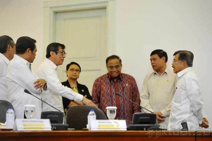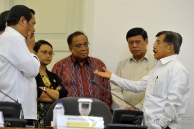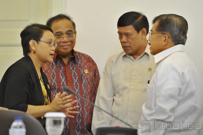 Wapres Jusuf Kalla (kanan) berdiskusi dengan Jaksa Agung HM Prasetyo (kiri), Menlu Retno Marsudi (kedua kiri), Menko Kemaritiman Indroyono (tengah), Menkopolhukam Tedjo Edhy Purdijanto (kedua kanan) saat rapat terbatas membahas perbudakan ABK Benjina, di Kantor Kepresidenan, Jakarta, Selasa (7/4). Wapres mengimbau kementerian terkait untuk serius menangani kasus perbudakan anak buah kapal (ABK) yang terjadi di PT Pusaka Benjina Resources (PBR) terkait kasus perbudakan di Benjina, Kepulauan Aru, Maluku. ANTARA FOTO/Yudhi Mahatma