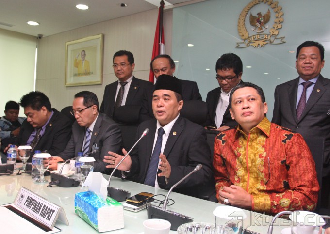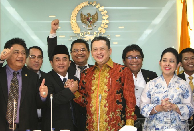 Ketua Fraksi Golkar versi Munas Bali Ade Komaruddin (ketiga kiri) bersama Sekretaris fraksi Bambang Soesatyo (tengah), Anggota DPR dari fraksi Partai Golkar Titiek Soeharto (kedua kanan) dan anggota fraksi Partai Golkar lainnya merayakan kemenangan sengketa kepemimpinan Partai Golkar di Kompleks Parlemen, Senayan, Jakarta, Senin (18/5). Pengadilan Tata Usaha Negara (PTUN) memenangkan kubu Aburizal Bakrie dalam sengketa kepemimpinan Partai Golkar.ANTARA FOTO/Reno Esnir/