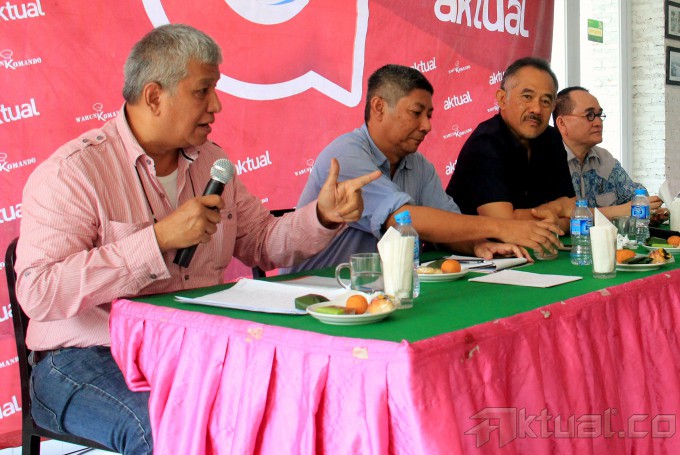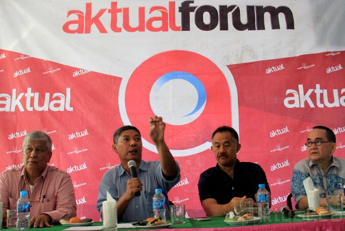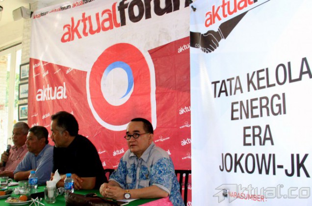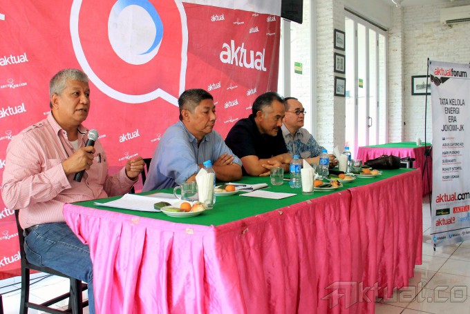 Pengamat Energi Yusri Usman, Moderator Hendrajit, Anggota Komisi VII DPR Hari Purnomo, Juru Biacara Partai Demokrat Ruhut Sitompul,dalam diskusi ” Tata Kelola Energi Era Jokowi-JK” , di Warung Komando, Tebet, Jakarta Selatan, Minggu (31/5/2015). Carut marut sektor energi Indonesia adalah akibat dari bergantungnya pada impor minyak, baik crude maupun produk bahan bakar minyak BBM. Terlebih selama ini mindset yang masih tertanam adalah Indonesia sebagai negara atau pemerintahan yang kaya akan energi, padahal faktanya Indonesia saat ini masih tergantung pada impor. AKTUAL/MUNZIR