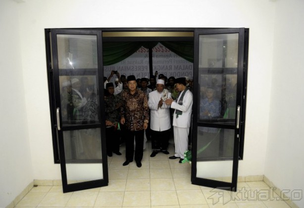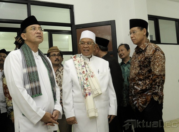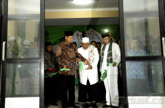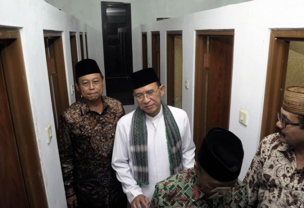 Menteri Perumahan Rakyat, Djan Faridz (kanan), Pemilik Pondok, KH. Ahmad Syahid (tengah), dan Menteri Agama, Surya Dharma Ali (kiri) saat meninjau Rumah Susun Sederhana Sewa (Rusunawa) Pondok Pesantren Al-Falah di Cicalengka, Bandung, Jawa Barat, Selasa (25/3/2014). Menpera meresmikan Rusun untuk anak-anak santri guna mendapatkan hunian yang lebih layak dan nyaman. Aktual/Istimewa